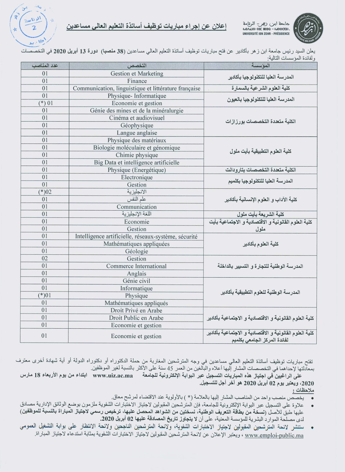 Alwadifa Agadir / Alwadifa doctorat / Alwadifa Maroc / Autres offres d'emploi / Emploi public / Offre d'emploi maroc / Offres d'emploi doctorat / Par fonction / Par ville جامعة ابن زهر – أكادير مباراة توظيف 38 أستاذ التعليم العالي مساعد آخر أجل 2 ابريل 2020 ShareSharePin It جامعة ابن زهر – أكادير مباراة توظيف 38 أستاذ التعليم العالي مساعد آخر أجل 2 ابريل 2020