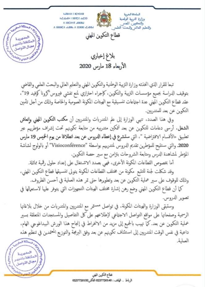 Alwadifa Maroc / Autres offres d'emploi / Emploi news / Emploi public / Offre d'emploi maroc انطلاق التكوين عن بعد لفائدة متدربي التكوين المهني ابتداء من 19 مارس 2020 ShareSharePin It انطلاق التكوين عن بعد لفائدة متدربي التكوين المهني ابتداء من 19 مارس 2020