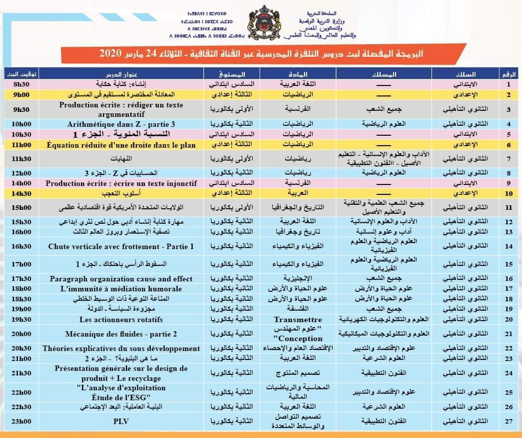 Alwadifa Maroc / Emploi public / Ministère de l'éducation / Offre d'emploi maroc / Par ministere البرمجة المفصلة لبث الدروس المدرسية عبر القناة الثقافية ليوم الثلاثاء 24 مارس 2020 ShareSharePin It برامج القناة الرابعة الثقافية ليوم الثلاثاء 24 مارس 2020