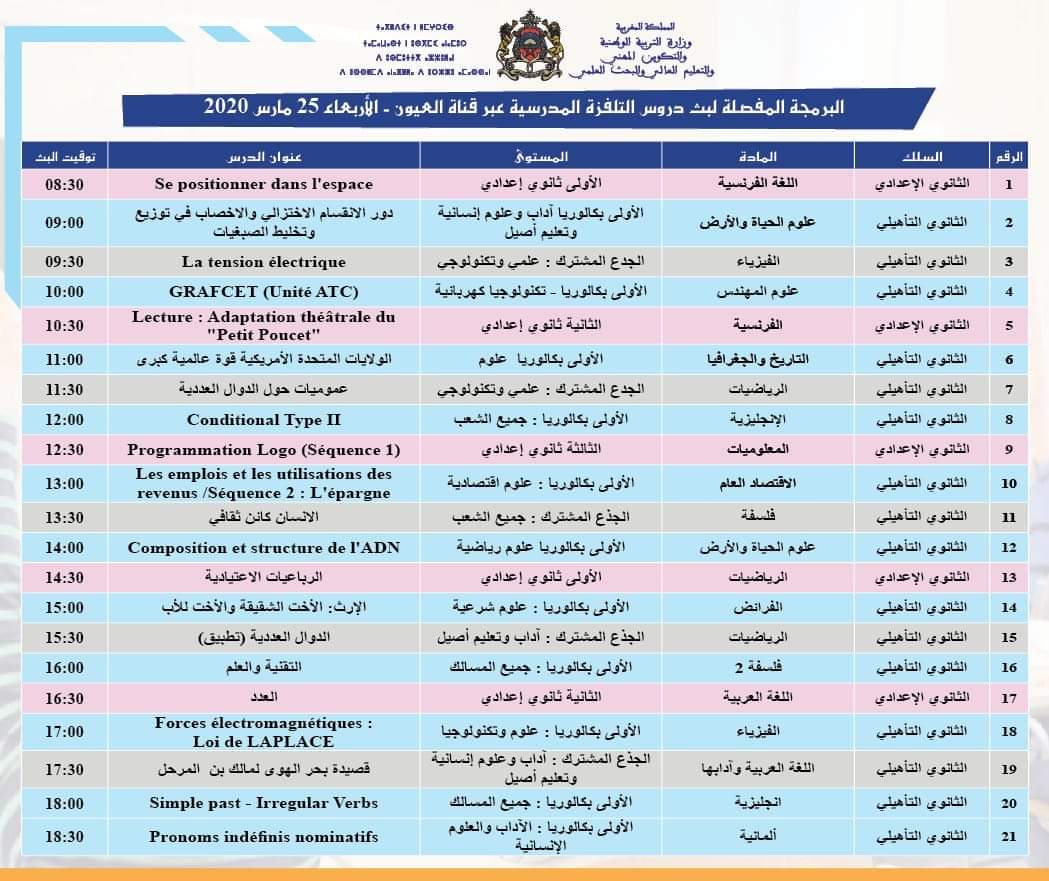 Alwadifa Maroc / Emploi public / Ministère de l'éducation / Offre d'emploi maroc / Par ministere البرمجة المفصلة لبث الدروس عن بعد بقناة العيون ليوم الأربعاء 25 مارس 2020 ShareSharePin It البرمجة المفصلة لبث الدروس عن بعد بقناة العيون ليوم الأربعاء 25 مارس 2020