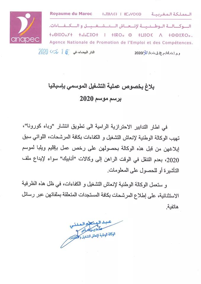Alwadifa ANAPEC / Alwadifa Maroc / Autres offres d'emploi / Emploi news / Offres d'emploi ANAPEC / Type أنابيك بلاغ بخصوص عملية التشغيل الموسمي بإسبانيا برسم موسم 2020 ShareSharePin It أنابيك بلاغ بخصوص عملية التشغيل الموسمي بإسبانيا برسم موسم 2020