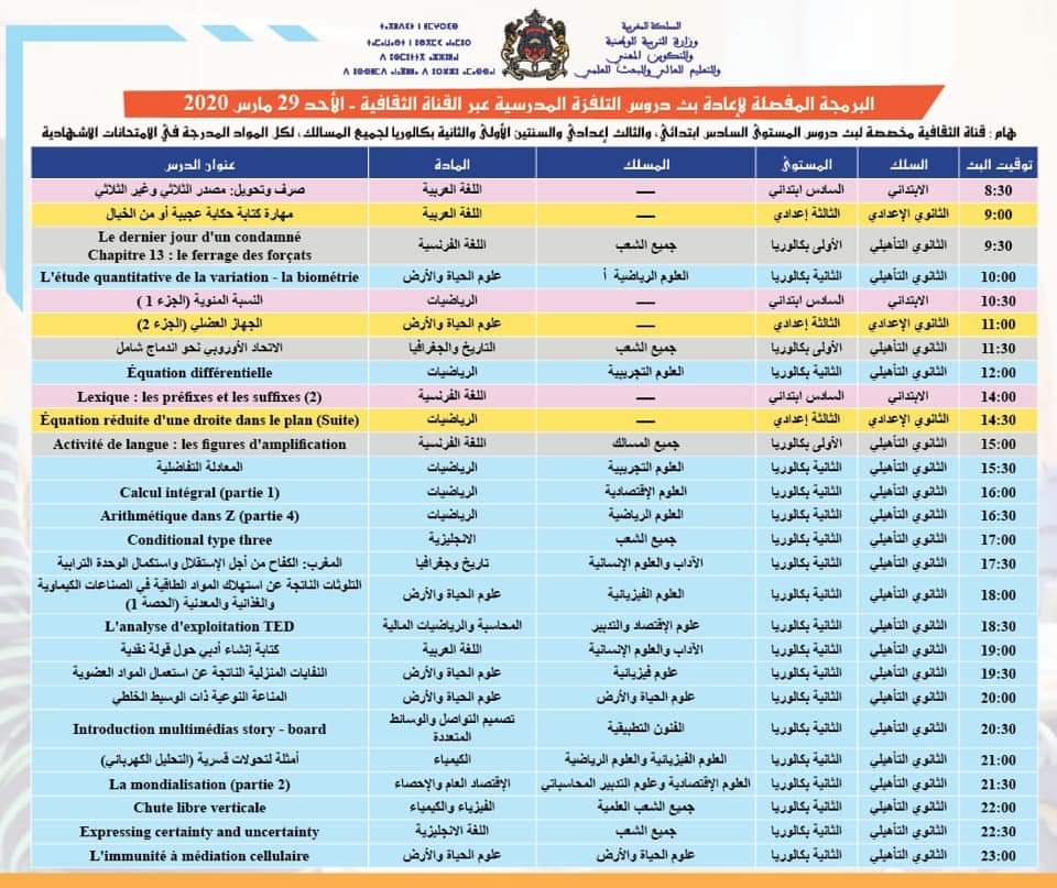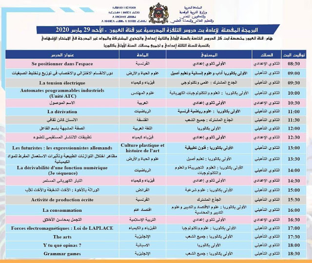 Alwadifa Maroc / Emploi public / Ministère de l'éducation / Offre d'emploi maroc / Par ministere برمجة بث دروس التلفزة المدرسية على قنوات « الثقافية » و »الأمازيغية » و « العيون » ليوم الأحد 29 مارس 2020 ShareSharePin It برمجة بث دروس التلفزة المدرسية على قنوات « الثقافية » و »الأمازيغية » و « العيون » ليوم الأحد 29 مارس 2020