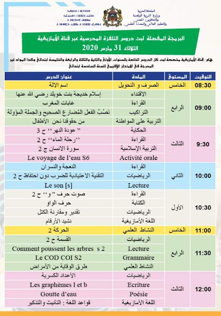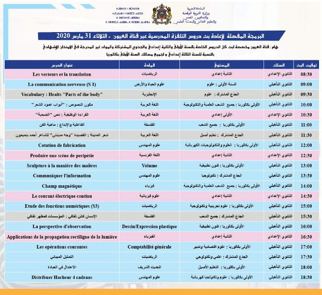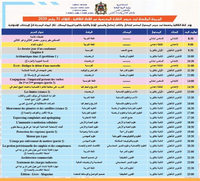 Alwadifa Maroc / Emploi public / Ministère de l'éducation / Offre d'emploi maroc / Par ministere برمجة بث دروس التلفزة المدرسية على قنوات « الثقافية » و »الأمازيغية » و « العيون » ليوم الثلاثاء 31 مارس 2020 ShareSharePin It برمجة بث دروس التلفزة المدرسية على قنوات « الثقافية » و »الأمازيغية » و « العيون » ليوم الثلاثاء 31 مارس 2020