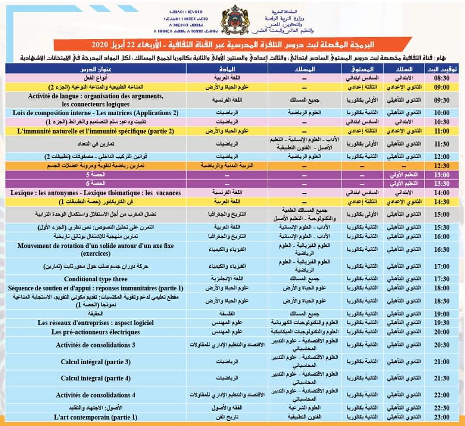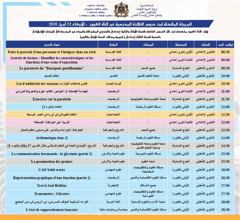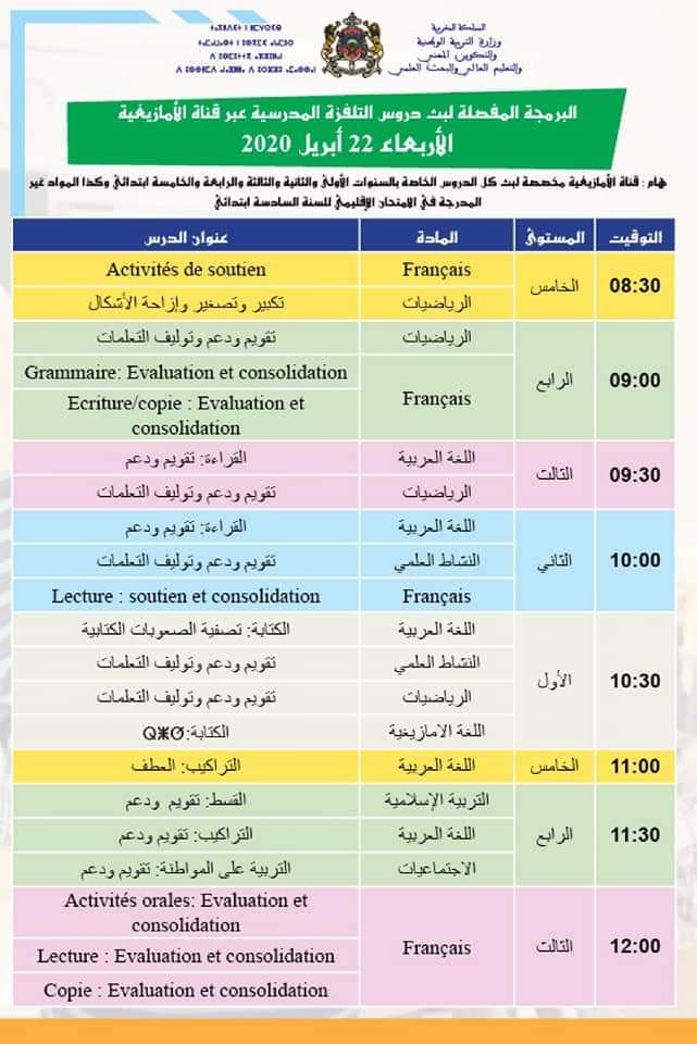 Alwadifa Maroc / Emploi public / Ministère de l'éducation / Offre d'emploi maroc / Par ministere برمجة بث دروس التلفزة المدرسية عبر قنوات » الثقافية » و « الأمازيغية » و « العيون » ليوم الاربعاء 22 أبريل 2020 ShareSharePin It برمجة بث دروس التلفزة المدرسية عبر قنوات » الثقافية » و « الأمازيغية » و « العيون » ليوم الاربعاء 22 أبريل 2020