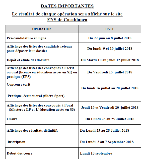 Alwadifa Casablanca / Alwadifa licence / Alwadifa Maroc / Alwadifa master / Autres offres d'emploi / Licence professionnelle / Offre d'emploi maroc / Par fonction / Par ville وظائف :الإعلان عن مباراة ولوج المدرسة العليا للأساتذة الدار البيضاء برسم السنة الجامعية ShareSharePin It الإعلان عن مباراة ولوج المدرسة العليا للأساتذة الدار البيضاء برسم السنة الجامعية 2018-2019 Pré-inscription : ENS Casa
