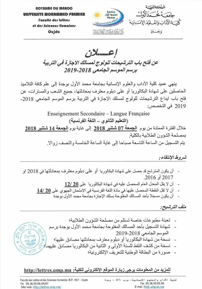 Alwadifa Maroc / Alwadifa Oujda / Autres offres d'emploi / Etablissement Public / Licence professionnelle / Par ville / Type التسجيل بمسلك الاجازة في التربية بجامعة محمد الاول وجدة 2019/2018 ShareSharePin It التسجيل بمسلك الاجازة في التربية بجامعة محمد الاول وجدة 2019/2018