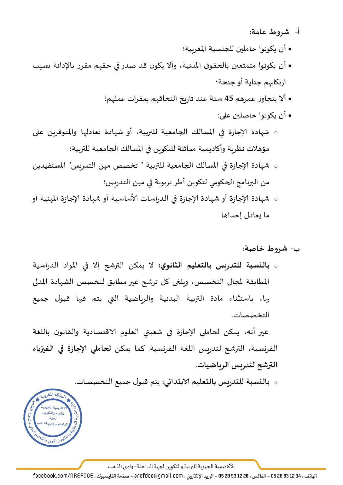 Alwadifa Dakhla / Alwadifa Maroc / Alwadifa TAALIM / Autres offres d'emploi / Offres d'emploi Licence / Par fonction / Par ville / Voir les autres villes وظائف الأكاديمية الجهوية للتربية والتكوين لجهة الداخلة واد الذهب: مباراة توظيف 178 أستاذ(ة) متعاقد(ة). آخر أجل 9 يناير ShareSharePin It الأكاديمية الجهوية للتربية والتكوين لجهة الداخلة واد الذهب: مباراة توظيف 178 أستاذ(ة) متعاقد(ة). آخر أجل 9 يناير 2018 تحميل الإعلان