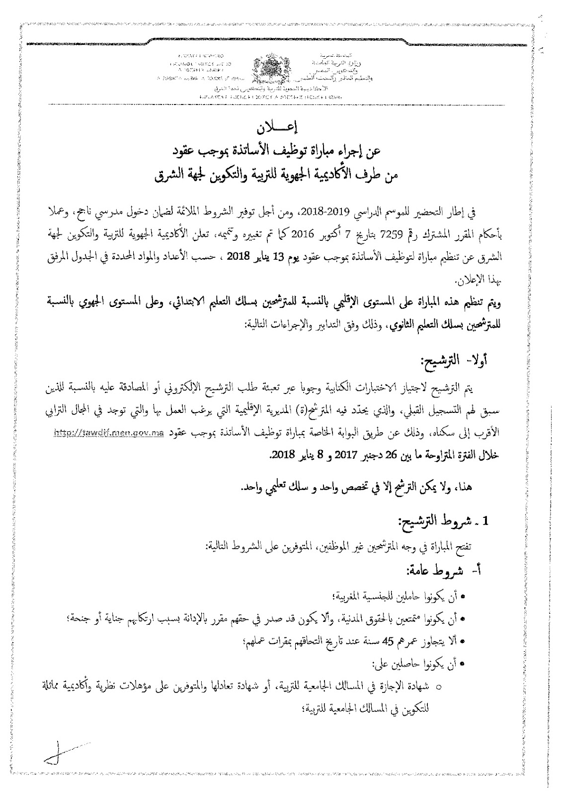 Alwadifa Maroc / Alwadifa TAALIM / Autres offres d'emploi / Offres d'emploi Licence / Par fonction / Par ville / Voir les autres villes وظائف الأكاديمية الجهوية للتربية والتكوين لجهة الشرق : مباراة لتوظيف 1469 أستاذ(ة) بموجب عقد اخر أجل هو 09 يناير ShareSharePin It الأكاديمية الجهوية للتربية والتكوين لجهة الشرق : مباراة لتوظيف 1469 أستاذ(ة) بموجب عقد اخر أجل هو 09 يناير 2018 تحميل الإعلان