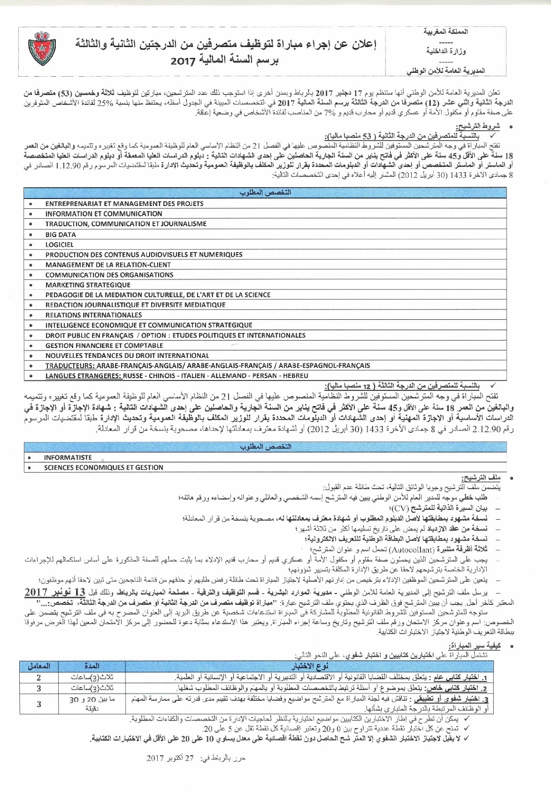 وزارة الداخلية -المديرية العامة للأمن الوطني مباراة لتوظيف 12 متصرفا من الدرجة الثالثة آخر أجل هو 13 نونبر 2017