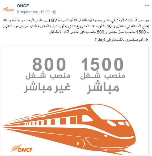 وكتب المكتب بحسابه على الفايسبوك: ” من غير امتيازات الوقت لي غادي يمنحوا لينا القطار الفائق السرعة TGV بين الدار البيضاء و طنجة و ذلك بقطع المسافة في ساعتين و 10 دقائق ، هذا المشروع غادي يخلق للشباب المغاربة العديد من فرص الشغل : 00- 15منصب شغل مباشر و 800 منصب غير مباشر أثناء الاستغلال هل أنتم مستعدون للانضمام إلى فريقنا”.