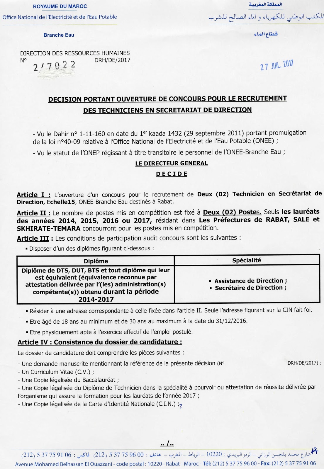 Alwadifa Maroc / Alwadifa technicien / Alwadifa tout le Maroc / Autres offres d'emploi / Offre d'emploi maroc / Offres d'emploi technicien / Par fonction / Par ville وظائف المكتب الوطني للكهرباء والماء الصالح للشرب ء قطاع الماء مباراة لتوظيف 02 تقني المساعدة الادارية آخر أجل هو 07 شتنبر ShareSharePin It المكتب الوطني للكهرباء والماء الصالح للشرب – قطاع الماء مباراة لتوظيف 02 تقني المساعدة الادارية آخر أجل هو 07 شتنبر 2017