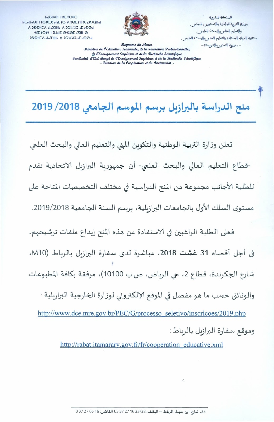 Alwadifa Maroc / Autres offres d'emploi / Bourses d'études / Ministère de l'éducation / Par ministere البرازيل: منح الدراسة بالسلك الأول برسم سنة 2019/2018 ShareSharePin It البرازيل: منح الدراسة بالسلك الأول برسم سنة 2018/2019