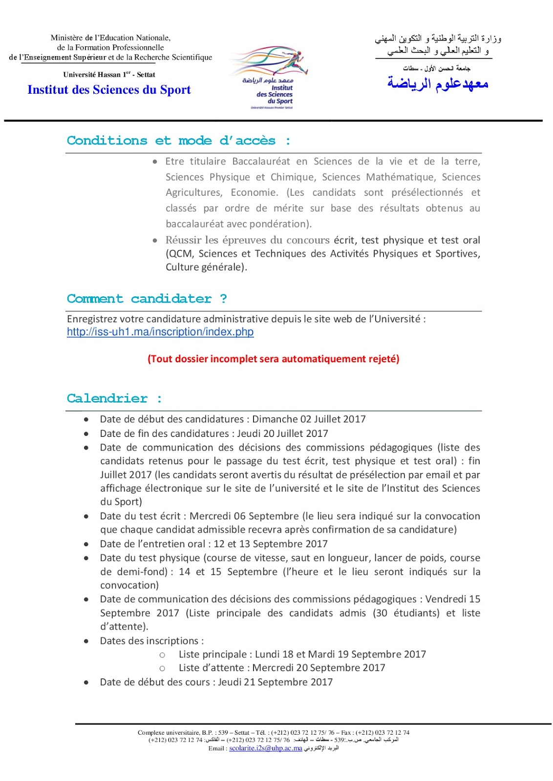 Alwadifa Maroc / Alwadifa Settat / Alwadifa TAALIM / Autres offres d'emploi / Licence professionnelle / Par ville وظائف معهد علوم الرياضة بسطات مباراة ولوج السنة الاولى من الاجازة المهنية في التربية البدنية و الرياضة آخر آجل 20 يوليوز ShareSharePin It معهد علوم الرياضة بسطات مباراة ولوج السنة الاولى من الاجازة المهنية في التربية البدنية و الرياضة آخر آجل 20 يوليوز 2017 للتسجيل اضغط هنا