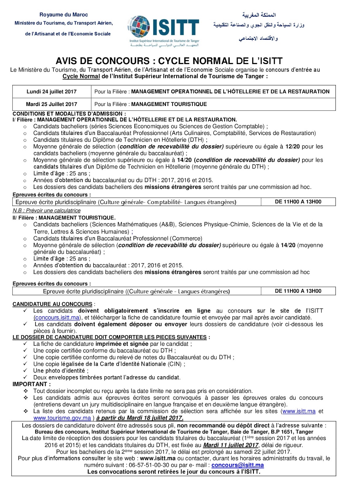 Alwadifa baccalauréat / Alwadifa Maroc / Alwadifa tout le Maroc / Autres offres d'emploi / Par ville مباراة ولوج السلك العادي بالمعهد العالي الدولي للسياحة. أخر أجل للترشيح هو 11 يوليوز 2017 ShareSharePin It مباراة ولوج السلك العادي بالمعهد العالي الدولي للسياحة. أخر أجل للترشيح هو 11 يوليوز 2017