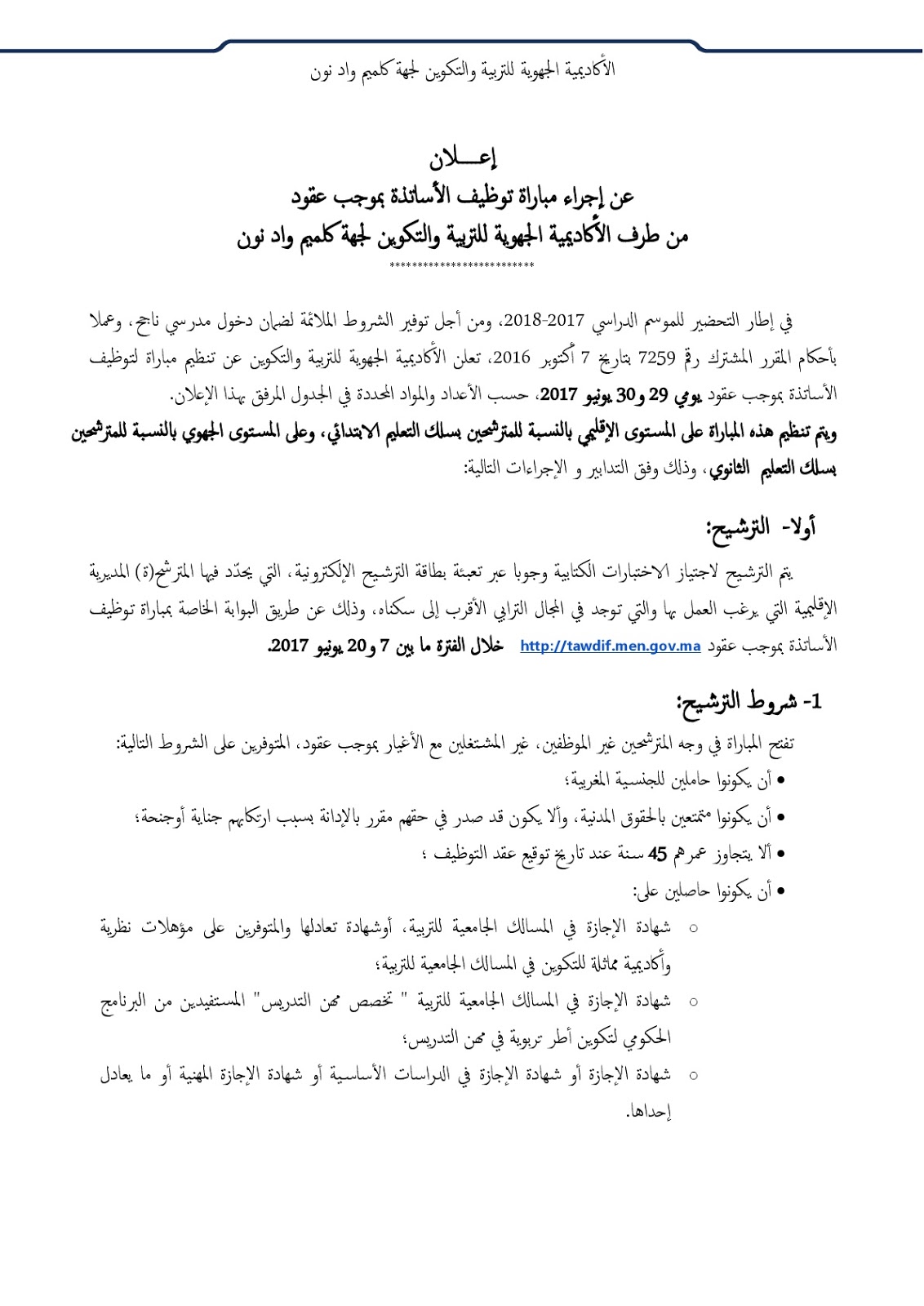 Alwadifa Guelmim / Alwadifa Maroc / Alwadifa TAALIM / Autres offres d'emploi / Offre d'emploi maroc / Offres d'emploi Licence / Par fonction / Par ville وظائف الأكاديمية الجهوية للتربية والتكوين لجهة كلميم واد نون مباراة لتوظيف 341 أستاذ بموجب عقد أخر أجل 21 يونيو ShareSharePin It الأكاديمية الجهوية للتربية والتكوين لجهة كلميم واد نون مباراة لتوظيف 341 أستاذ بموجب عقد أخر أجل 21 يونيو 2017