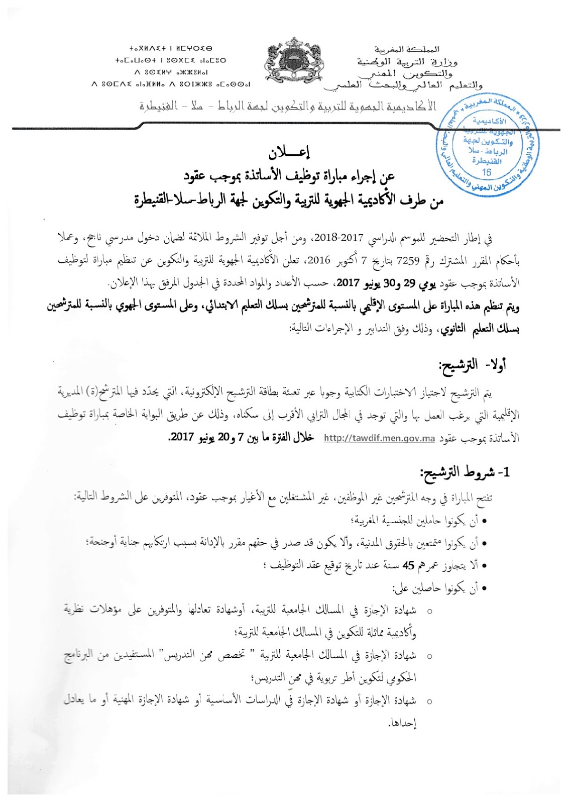 Alwadifa Kénitra / Alwadifa Maroc / Alwadifa Salé / Alwadifa TAALIM / Autres offres d'emploi / Par ville وظائف الأكاديمية الجهوية للتربية والتكوين لجهة الرباط سلا القنيطرة مباراة لتوظيف 1806 أستاذ بموجب عقد أخر أجل 21 يونيو ShareSharePin It الأكاديمية الجهوية للتربية والتكوين لجهة الرباط سلا القنيطرة مباراة لتوظيف 1806 أستاذ بموجب عقد أخر أجل 21 يونيو 2017