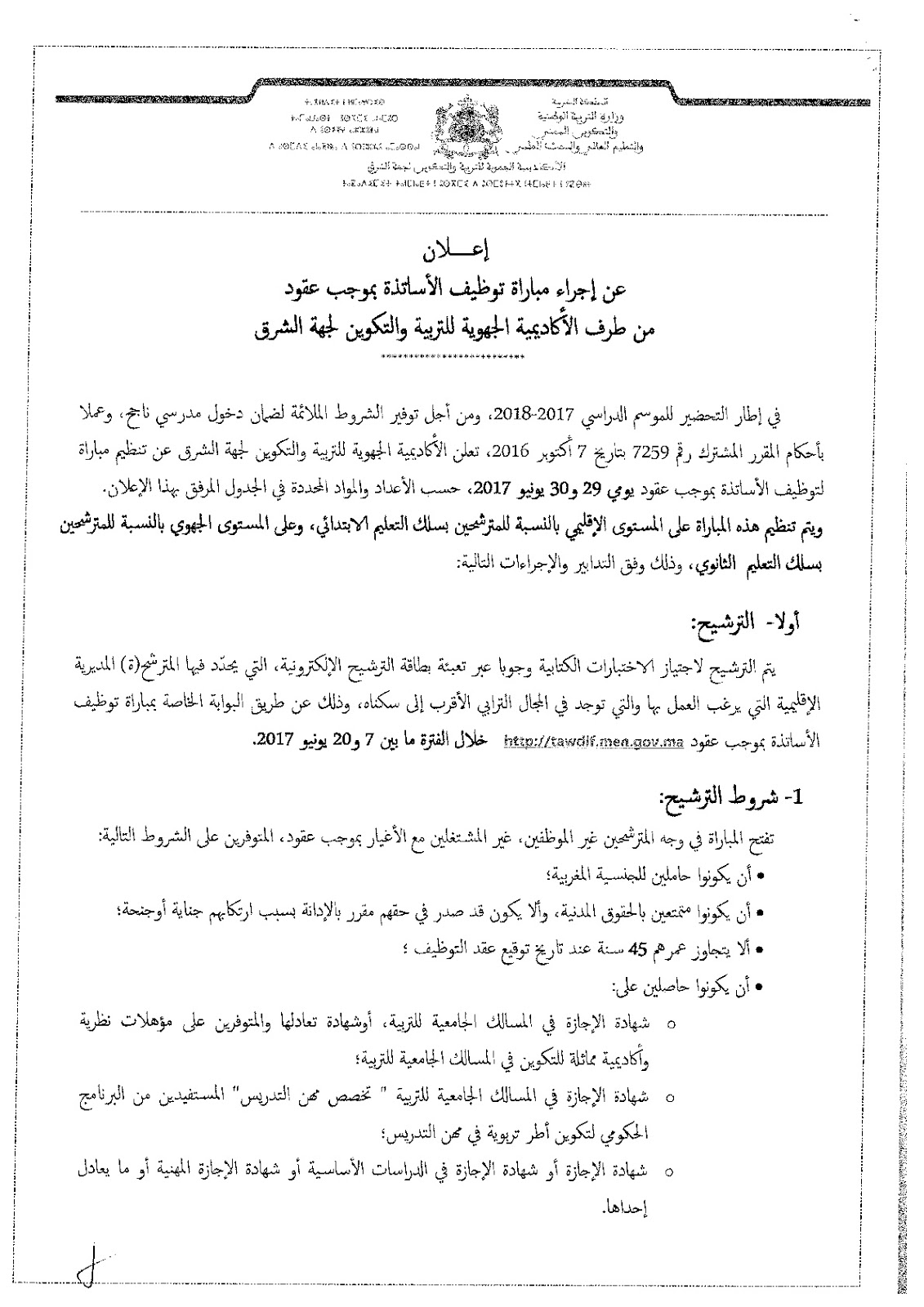Alwadifa Maroc / Alwadifa TAALIM / Autres offres d'emploi / Par ville / Voir les autres villes وظائف الأكاديمية الجهوية للتربية والتكوين لجهة الشرق مباراة لتوظيف 2055 أستاذ بموجب عقد أخر أجل 21 يونيو ShareSharePin It الأكاديمية الجهوية للتربية والتكوين لجهة الشرق مباراة لتوظيف 2055 أستاذ بموجب عقد أخر أجل 21 يونيو 2017