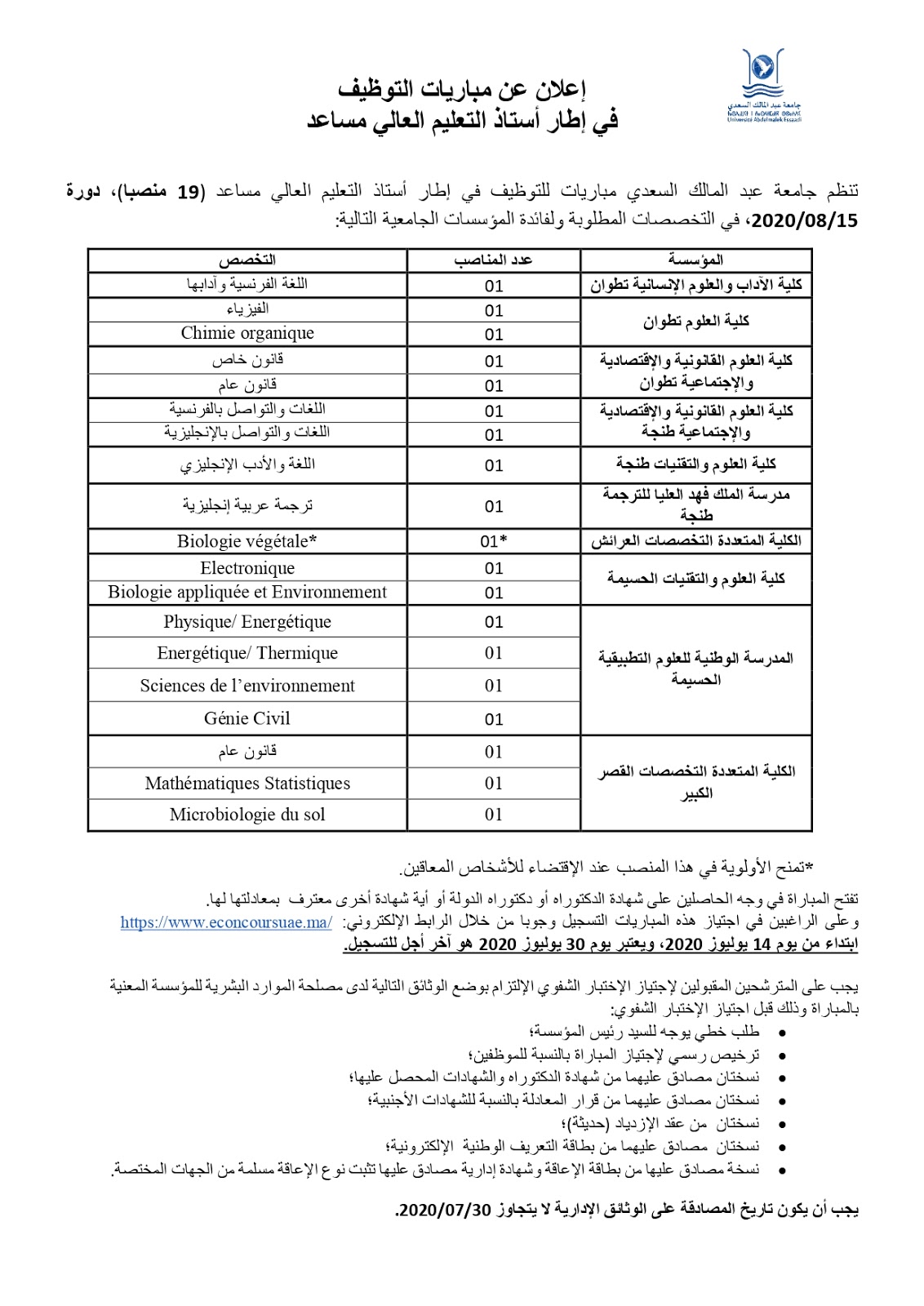 Alwadifa doctorat / Alwadifa Maroc / Alwadifa Tetouan / Autres offres d'emploi / Emploi public / Offre d'emploi maroc / Offres d'emploi doctorat / Par fonction / Par ville جامعة عبد المالك السعدي – تطوان مباريات توظيف 19 أستاذ التعليم العالي مساعد آخر أجل 30 يوليوز 2020 ShareSharePin It جامعة عبد المالك السعدي – تطوان مباريات توظيف 19 أستاذ التعليم العالي مساعد آخر أجل 30 يوليوز 2020 رابط الترشيح