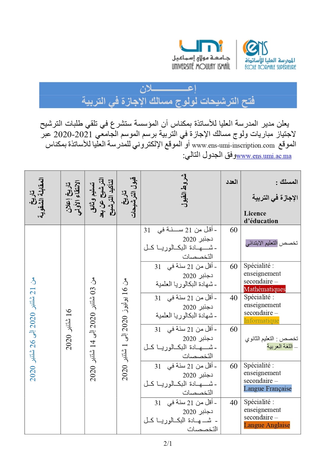 Alwadifa Maroc / Alwadifa Meknes / Autres offres d'emploi / Emploi public / Etablissement Public / Licence professionnelle / Offre d'emploi maroc / Par ville / Type المدرسة العليا للأساتذة بمكناس مباراة ولوج الاجازة في التربية 2020-2021 ShareSharePin It المدرسة العليا للأساتذة بمكناس مباراة ولوج الاجازة في التربية 2020-2021 ENS-Meknes-2020 رابط التسجيل