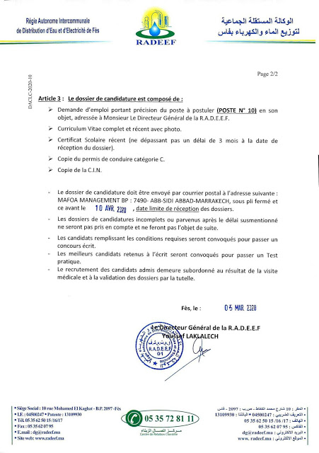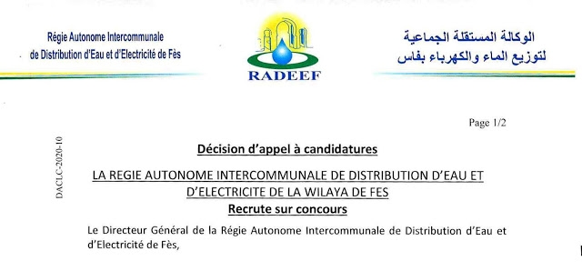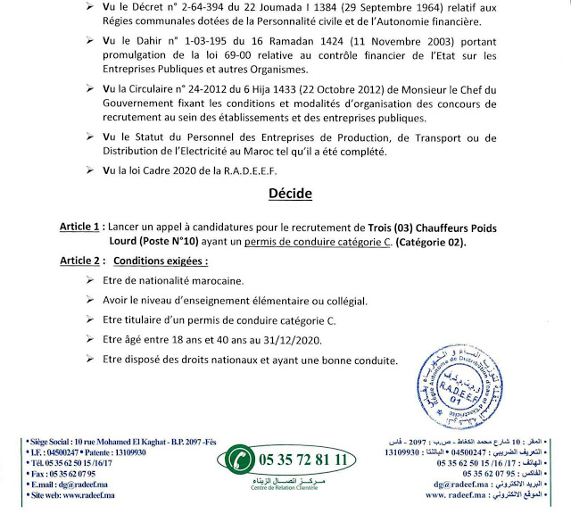 Alwadifa Maroc / Autres offres d'emploi / Emploi news / Emploi public / Offre d'emploi maroc تمديد تاريخ إيداع الترشيحات لمباراة توظيف سائق شاحنات الوزن الثقيل حــاصلين على رخصة السياقة صنف س بالوكالة المستقلة الجماعية لتوزيع الماء والكهرباء بفاس الى غاية 4 شتنبر 2020 ShareSharePin It تمديد تاريخ إيداع الترشيحات لمباراة توظيف سائق شاحنات الوزن الثقيل حــاصلين على رخصة السياقة صنف س بالوكالة المستقلة الجماعية لتوزيع الماء والكهرباء بفاس الى غاية 4 شتنبر 2020