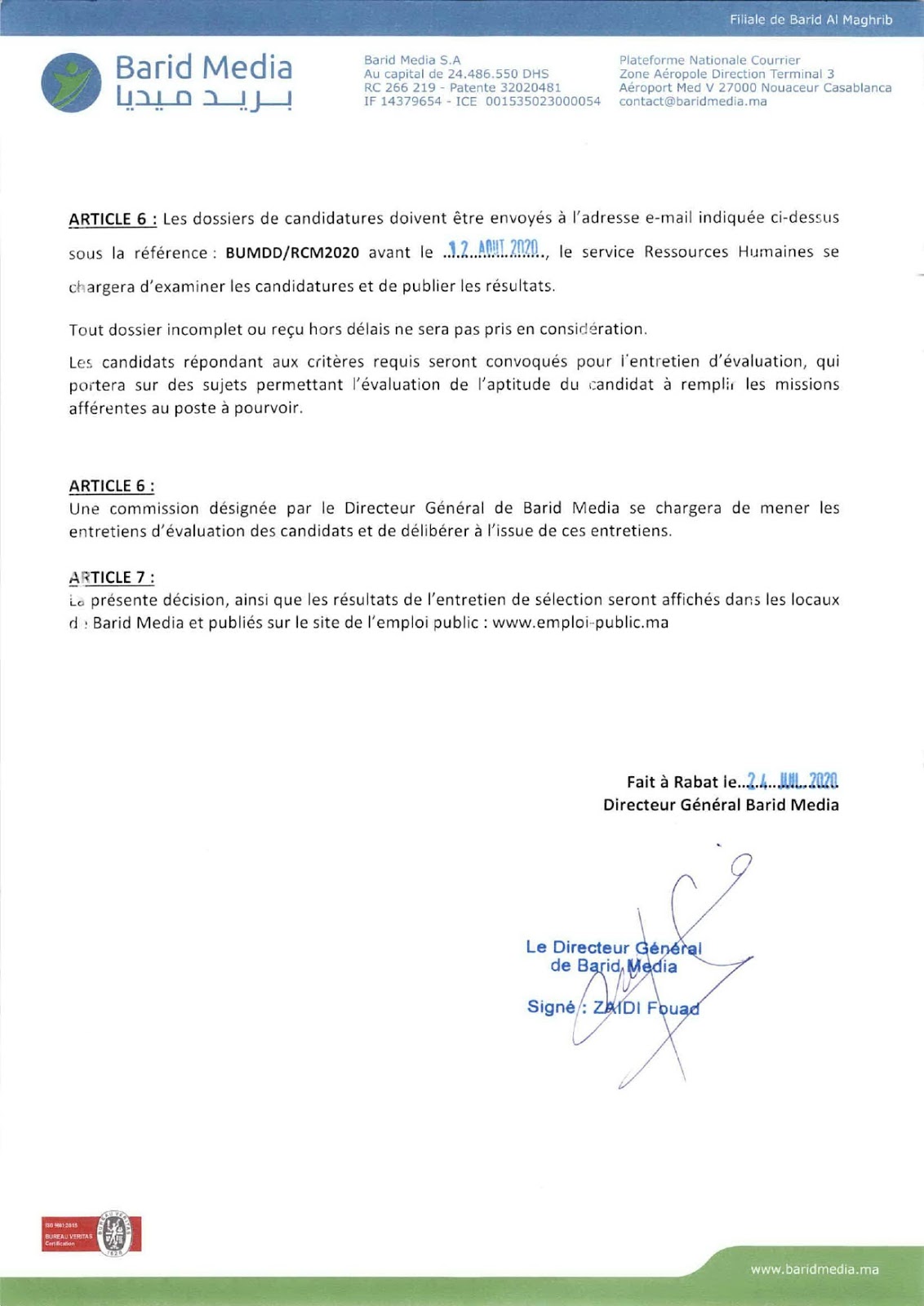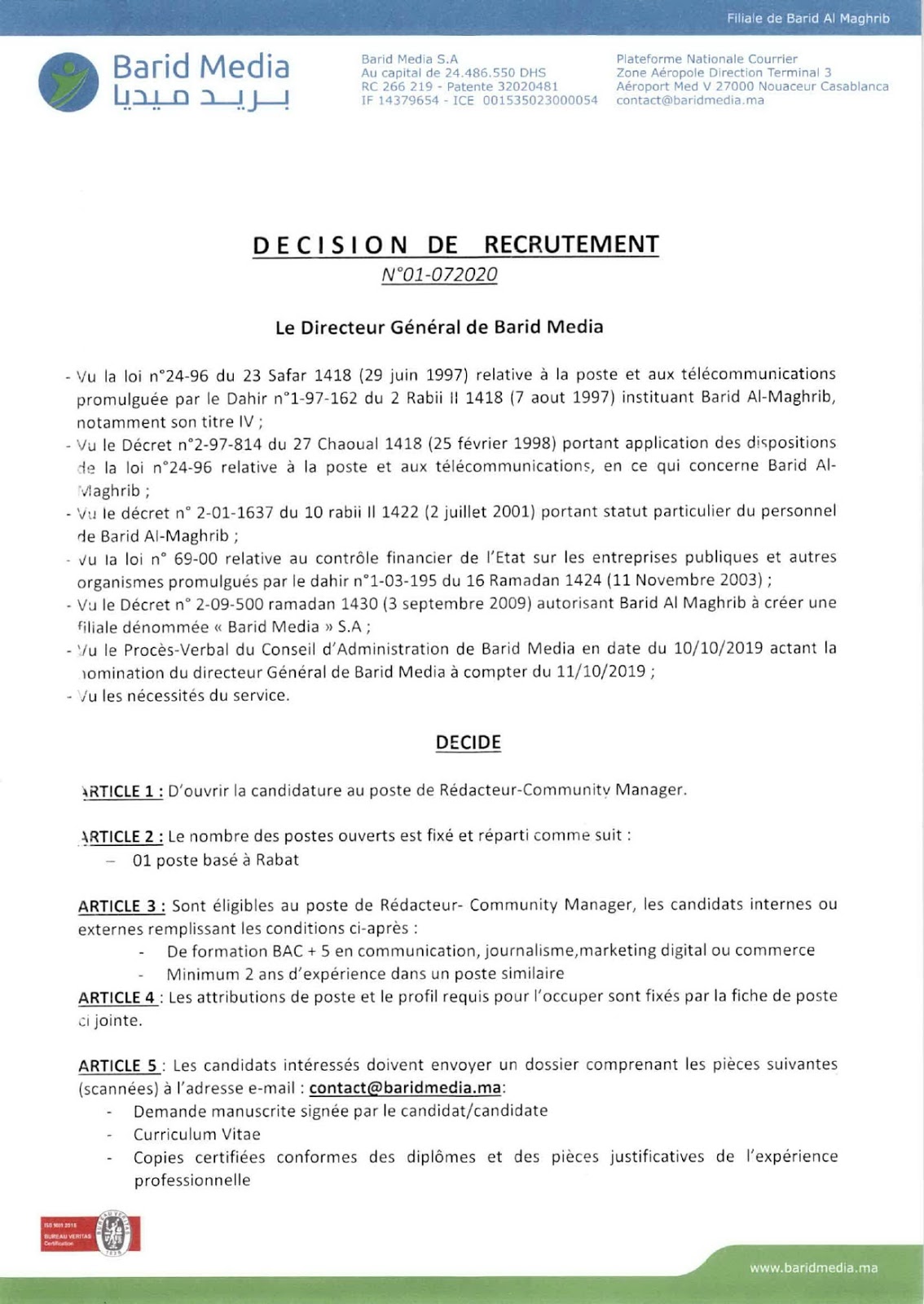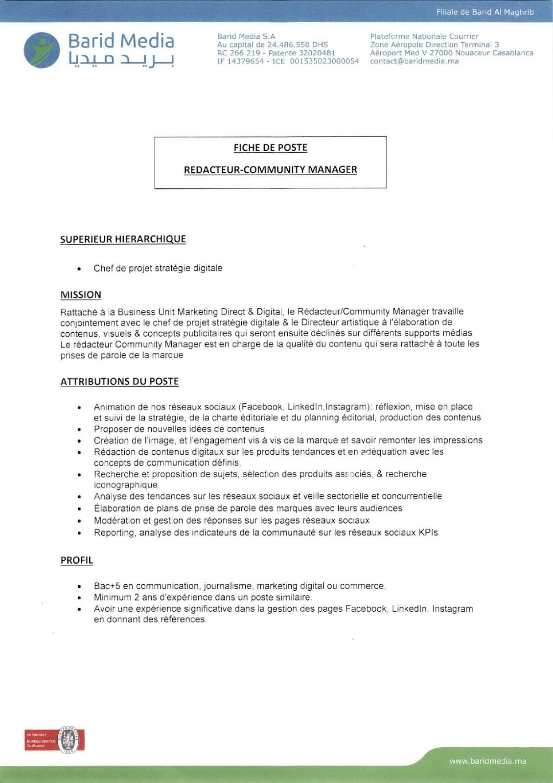 Alwadifa Maroc / Emploi public / Offre d'emploi maroc / Offres d'emploi Bac + 5 / Par fonction بريد ميديا مباراة لتوظيف ShareSharePin It بريد ميديا مباراة لتوظيف Rédacteur-Community Manager آخر أجل 12 غشت 2020