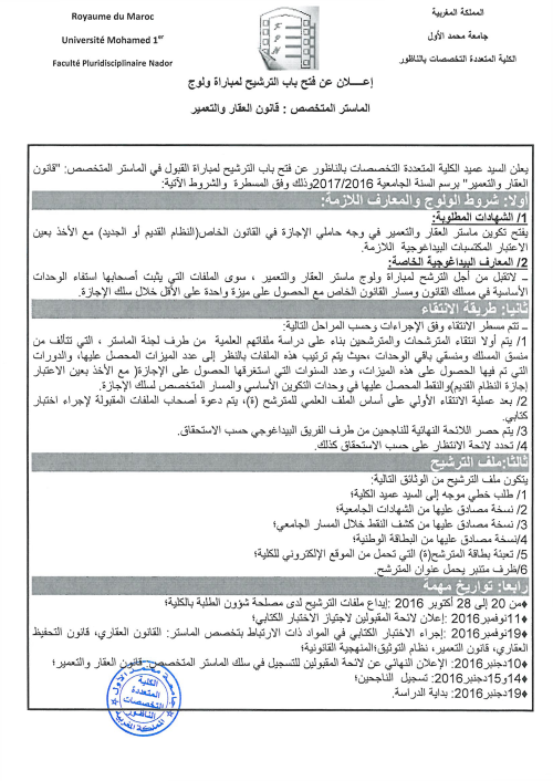 Alwadifa Maroc / Alwadifa master / Alwadifa Nador / Autres offres d'emploi / Offre d'emploi maroc / Offres d'emploi master / Par fonction / Par ville وظائف ماستر متخصص في قانون العقار والتعمير 2016/2017 بالكلية المتعددة التخصصات بالناظور ShareSharePin It ماستر متخصص في قانون العقار والتعمير 2016/2017 بالكلية المتعددة التخصصات بالناظور الكلية المتعددة التخصصات الناظور ماستر متخصص قانون العقار والتعمير تحميل الإعلان. تحميل بطاقة المترشح