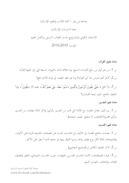 Alwadifa Agadir / Alwadifa Maroc / Autres offres d'emploi / Modèles d'examen / Par ville وظائف نموذج أسئلة الامتحان الكتابي لمباراة ولوج ماستر الخطاب الشرعي و تكامل العلوم ShareSharePin It نموذج أسئلة الامتحان الكتابي لمباراة ولوج ماستر الخطاب الشرعي و تكامل العلوم جامعة ابن زهر – أكادير كلية الآداب و العلوم الإنسانية شعبة الدراسات الإسلامية نموذج أسئلة الامتحان الكتابي لمباراة ولوج ماستر الخطاب الشرعي و تكامل العلوم