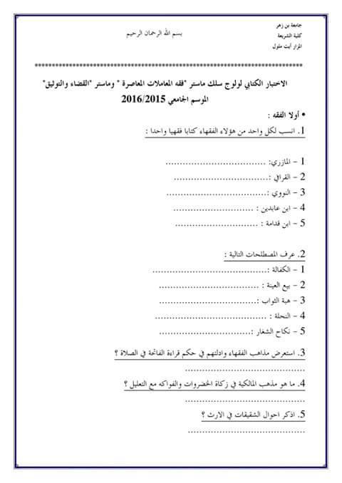 Alwadifa Agadir / Alwadifa Maroc / Autres offres d'emploi / Modèles d'examen / Par ville وظائف نماذج أسئلة الاختبار الكتابي لولوج ماستر فقه المعاملات المعاصرة و ماستر القضاء والتوثيق ShareSharePin It نماذج أسئلة الاختبار الكتابي لولوج ماستر فقه المعاملات المعاصرة و ماستر القضاء والتوثيق كلية الشريعة آيت ملول – أكادير أسئلة الاختبار الكتابي لولوج ماستر فقه المعاملات المعاصرة و ماستر القضاء والتوثيق