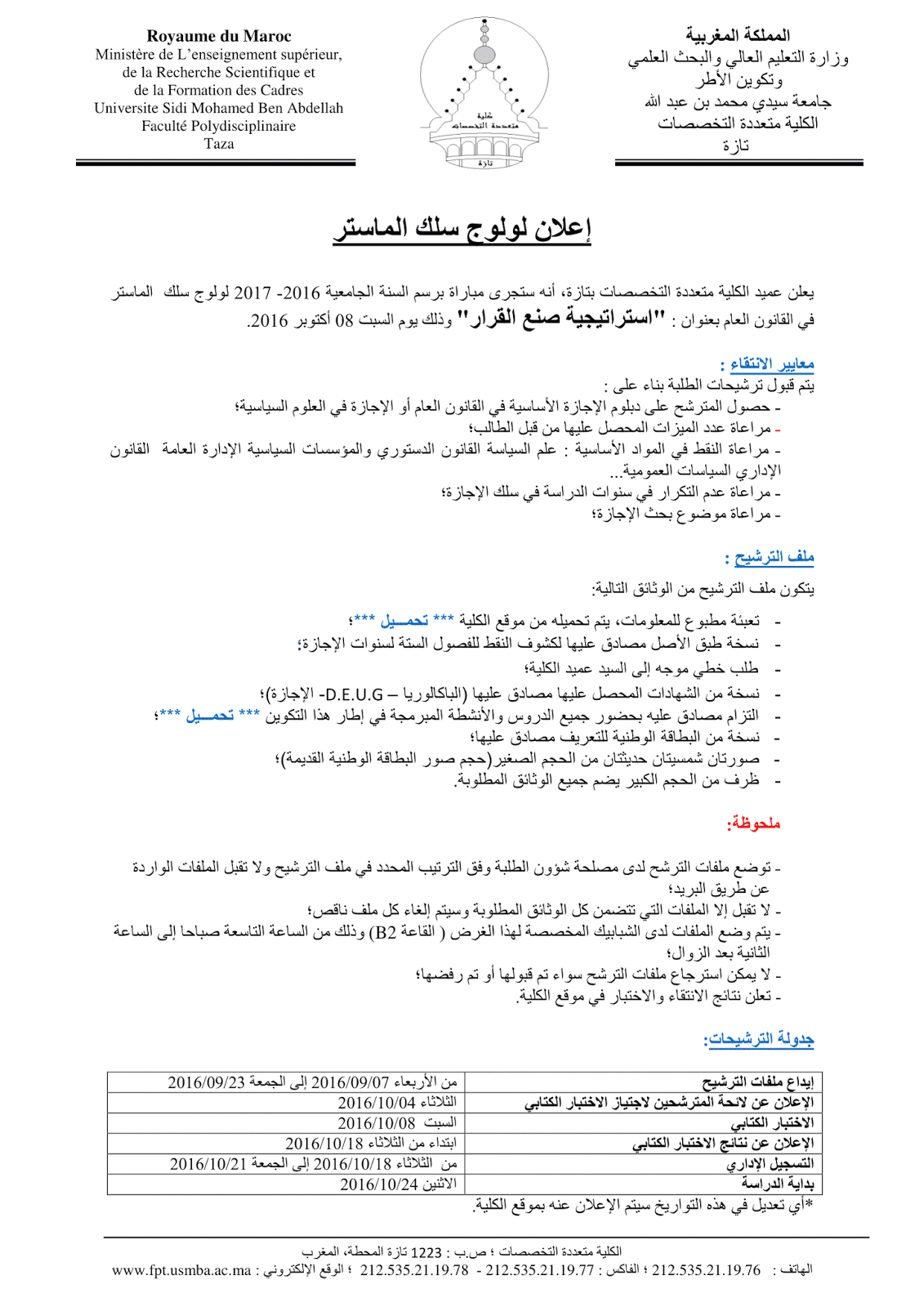 إعلان لولوج سلك الماستر: « استراتيجية صنع القرار » بالكلية متعددة التخصصات بتازة 2017/2016