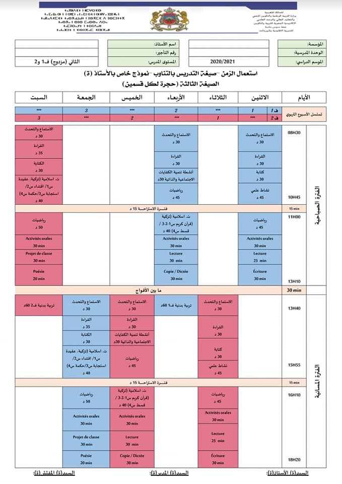 Alwadifa Maroc / Emploi public / Ministère de l'éducation / Offre d'emploi maroc / Par ministere استعمال الزمن للمستوى الثاني ابتدائي نمط التدريس بالتناوب 2020-2021 ShareSharePin It استعمال الزمن للمستوى الثاني ابتدائي نمط التدريس بالتناوب 2020-2021