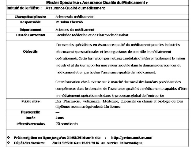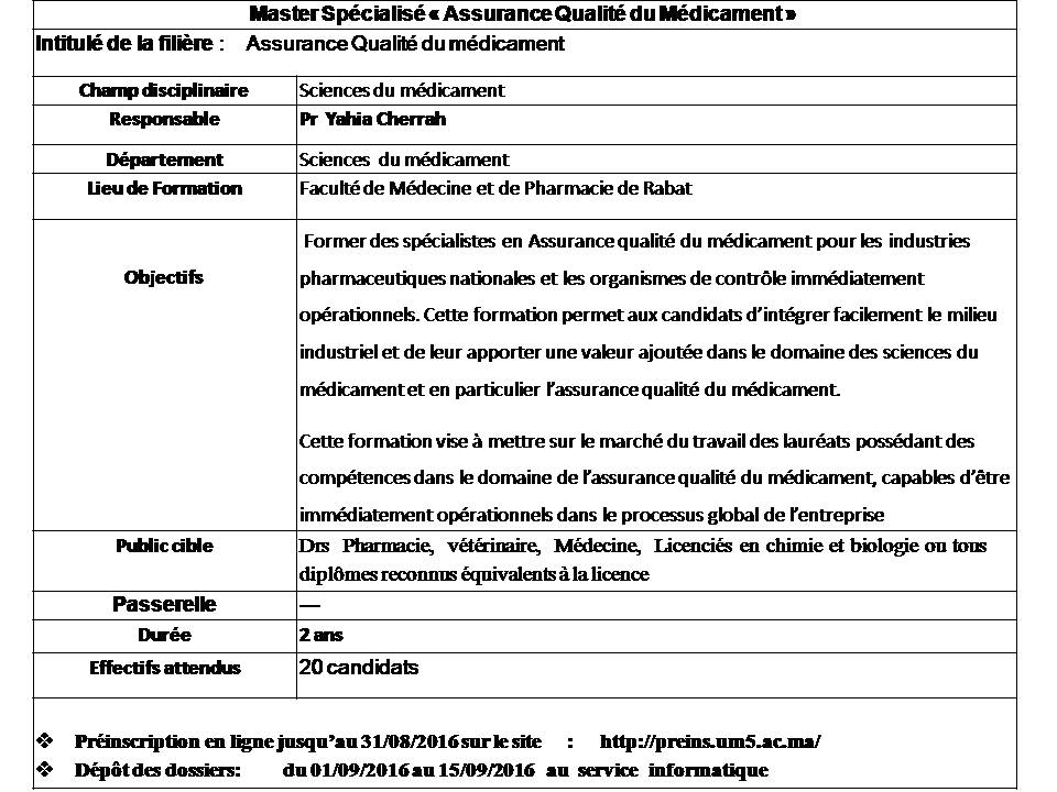 Master Spécialisé Assurance Qualité du Médicament à la Faculté de Médecine et de Pharmacie de Rabat 2016/2017