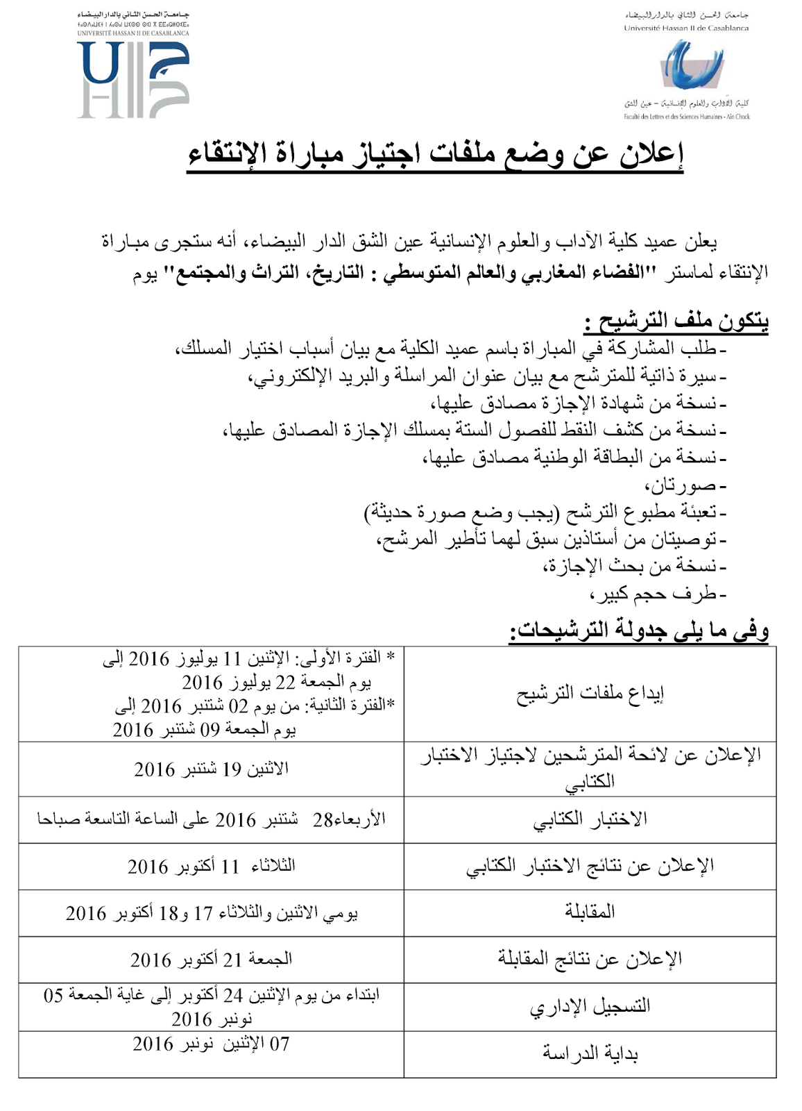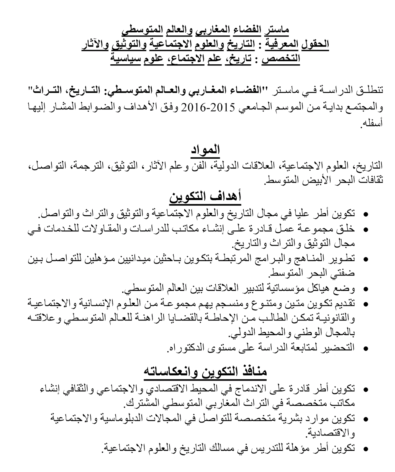 ماستر الفضاء المغاربي و العالم المتوسطي: التاريخ، التراث و لمجتمع 2017/2016 بكلية الآداب و العلوم الإنسانية عين الشق – الدار البيضاء