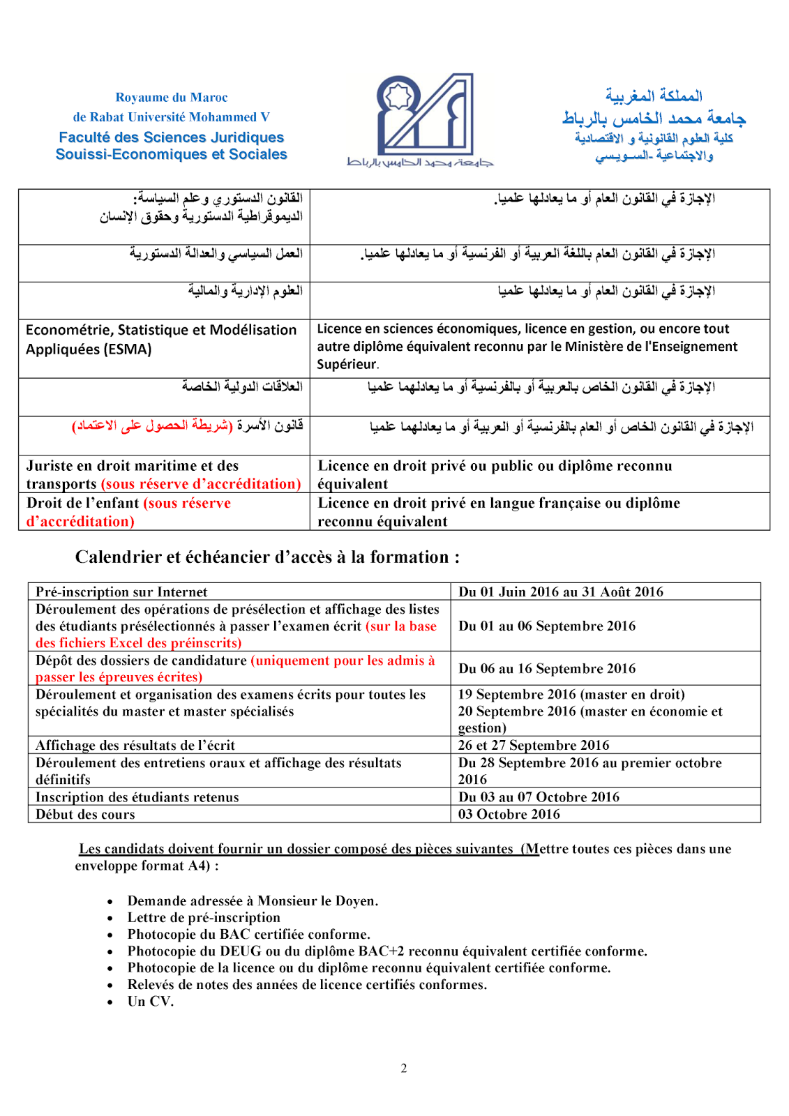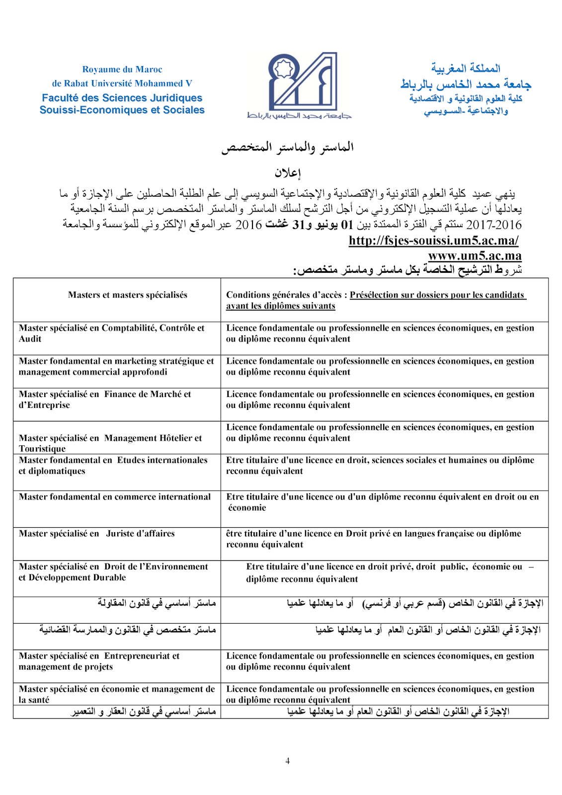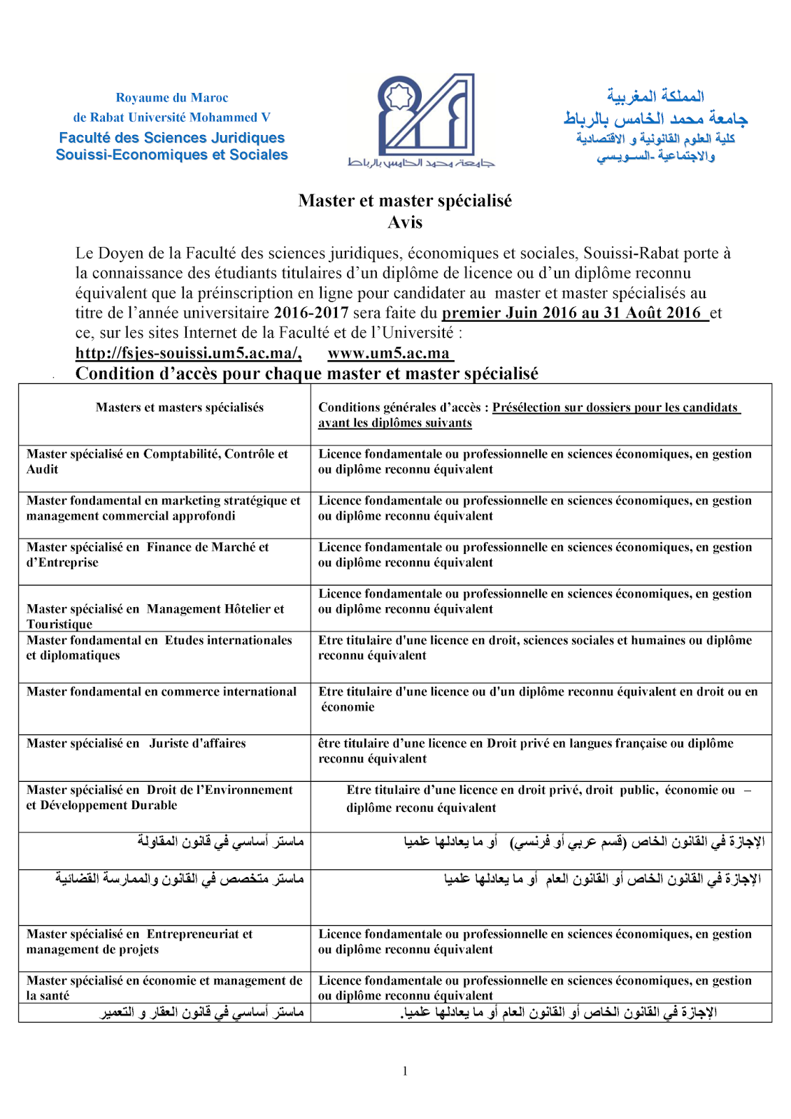 Le Doyen de la Faculté des sciences juridiques, économiques et sociales, Souissi-Rabat porte à la connaissance des étudiants titulaires d’un diplôme de licence ou d’un diplôme reconnu équivalent que la préinscription en ligne pour candidater au master et master spécialisés au titre de l’année universitaire 2016-2017 sera faite du premier Juin 2016 au 31 Août 2016 et ce, sur les sites Internet de la Faculté et de l’Université :