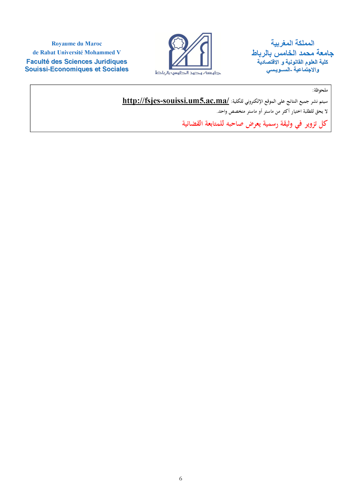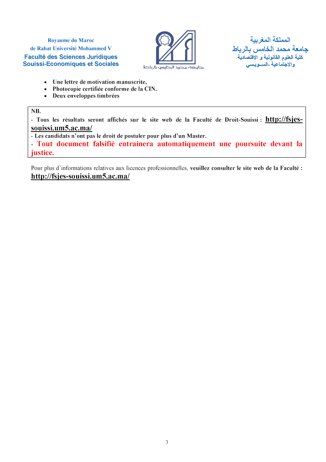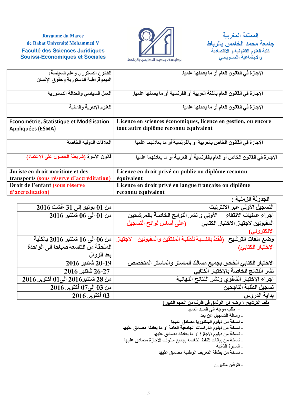 Le Doyen de la Faculté des sciences juridiques, économiques et sociales, Souissi-Rabat porte à la connaissance des étudiants titulaires d’un diplôme de licence ou d’un diplôme reconnu équivalent que la préinscription en ligne pour candidater au master et master spécialisés au titre de l’année universitaire 2016-2017 sera faite du premier Juin 2016 au 31 Août 2016 et ce, sur les sites Internet de la Faculté et de l’Université :