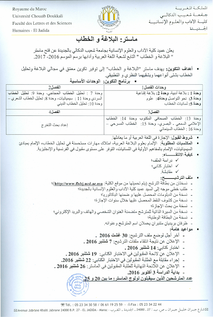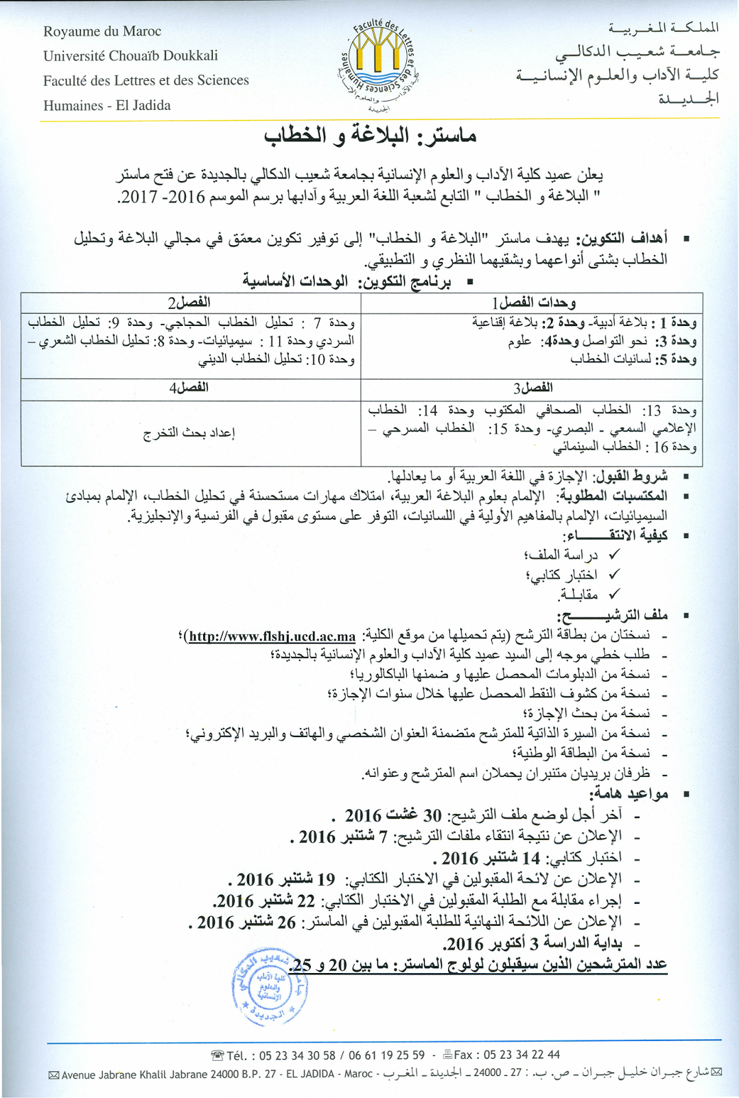 Alwadifa Eljadida / Alwadifa Maroc / Alwadifa master / Autres offres d'emploi / Offre d'emploi maroc / Offres d'emploi master / Par fonction / Par ville وظائف ماستر البلاغة و الخطاب (2016- 2017) بكلية الآداب و العلوم الإنسانية � الجديدة ShareSharePin It ماستر البلاغة و الخطاب (2016- 2017) بكلية الآداب و العلوم الإنسانية – الجديدة كلية الآداب و العلوم الإنسانية – الجديدة. ماستر « البلاغة والخطاب »التابع لشعبة اللغة العربية وآدابها. المرجو تحميل بطاقة الترشيح من هنا