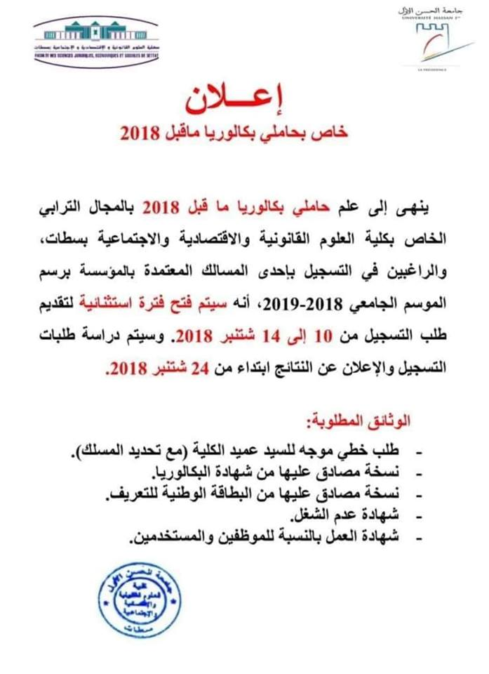 Alwadifa Maroc / Alwadifa Settat / Autres offres d'emploi / Emploi news / Par ville كلية العلوم القانونية والاقتصادية والاجتماعية سطات اعلان للطلبة الحاصلين على باكلوريا قديمة الراغبين في التسجيل برسم السنة الجامعية 2019/2018 ShareSharePin It كلية العلوم القانونية والاقتصادية والاجتماعية سطات اعلان لطلبة الحاصلين على باكلوريا قديمة الراغبين في التسجيل برسم السنة الجامعية 2019/2018