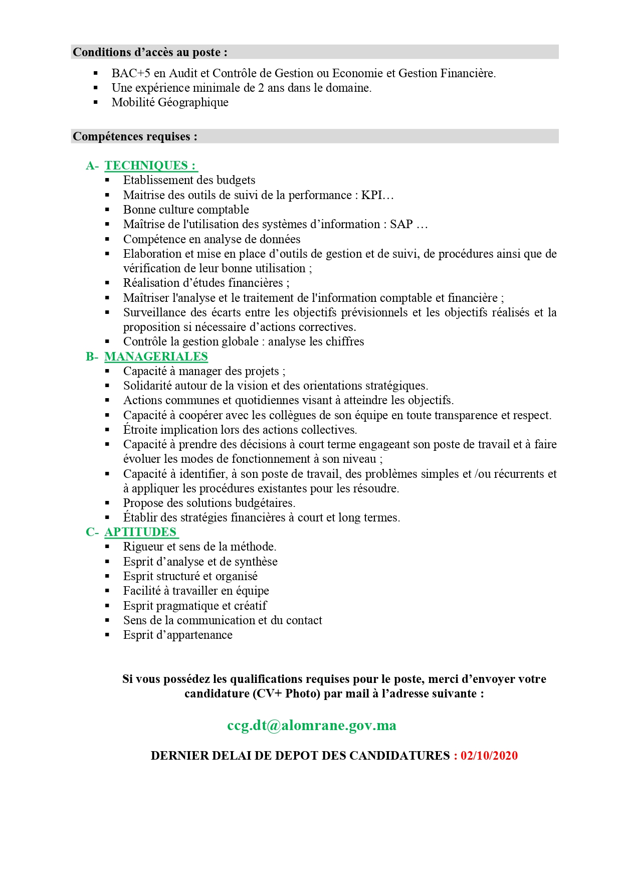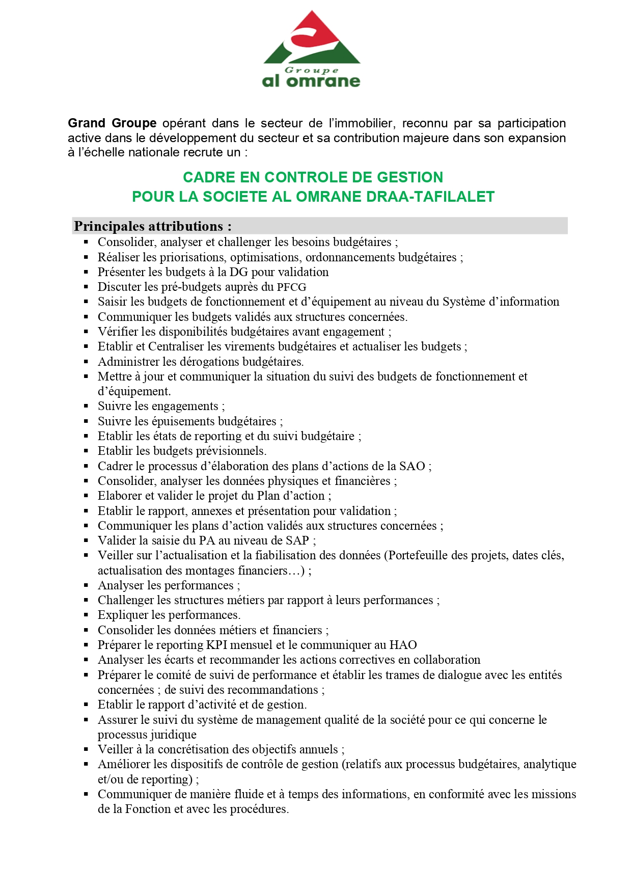 Alwadifa Maroc / Alwadifa tout le Maroc / Emploi public / Offre d'emploi maroc / Offres d'emploi Bac + 5 / Offres d’emploi AL OMRANE / Par fonction / Par ville / Type مجموعة التهيئة العمران مباراة توظيف 01 اطار في مراقبة التسيير آخر أجل 6 اكتوبر 2020 ShareSharePin It مجموعة التهيئة العمران مباراة توظيف 01 اطار في مراقبة التسيير آخر أجل 6 اكتوبر 2020