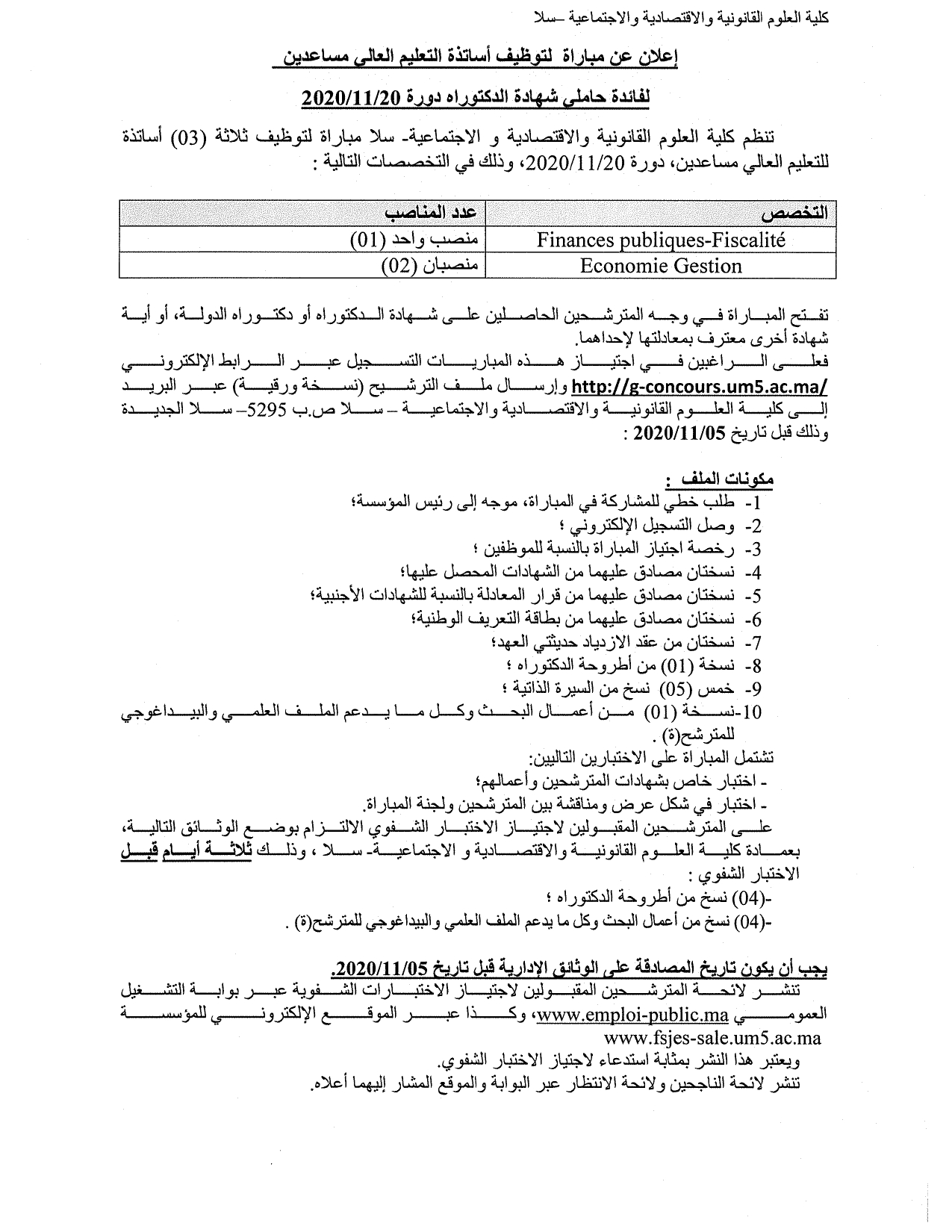 Alwadifa doctorat / Alwadifa Maroc / Alwadifa Salé / Autres offres d'emploi / Emploi public / Ministère de l'éducation / Offre d'emploi maroc / Offres d'emploi doctorat / Par fonction / Par ministere / Par ville مباراة توظيف 03 أساتذة التعليم العالي مساعدين بكلية الحقوق سلا آخر أجل 4 نونبر 2020 ShareSharePin It مباراة توظيف 03 أساتذة التعليم العالي مساعدين بكلية الحقوق سلا آخر أجل 4 نونبر 2020 رابط الترشيح