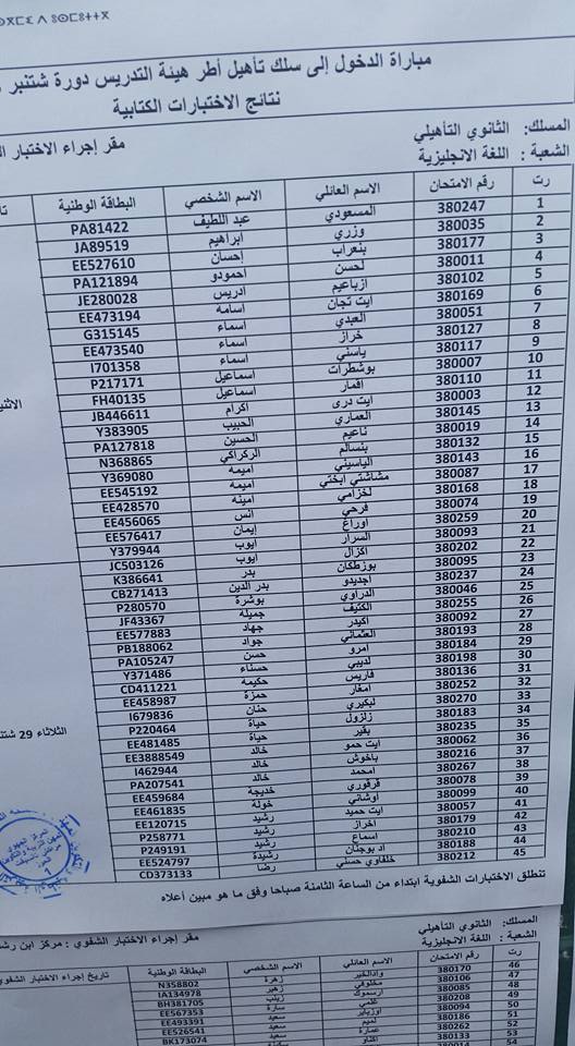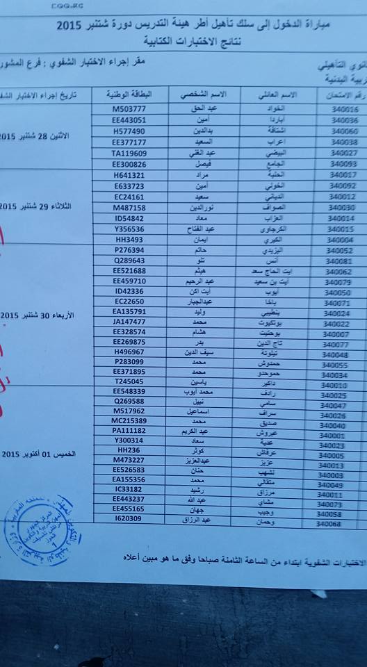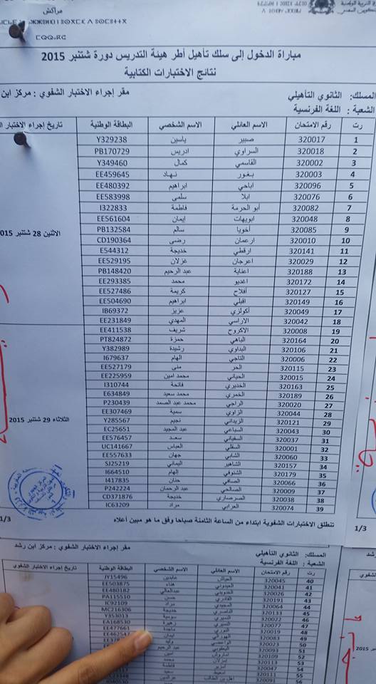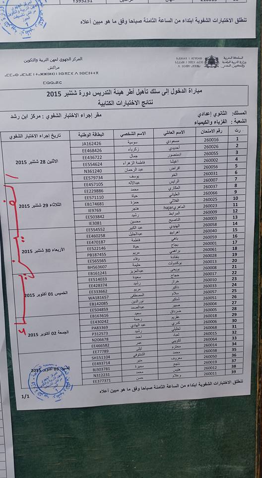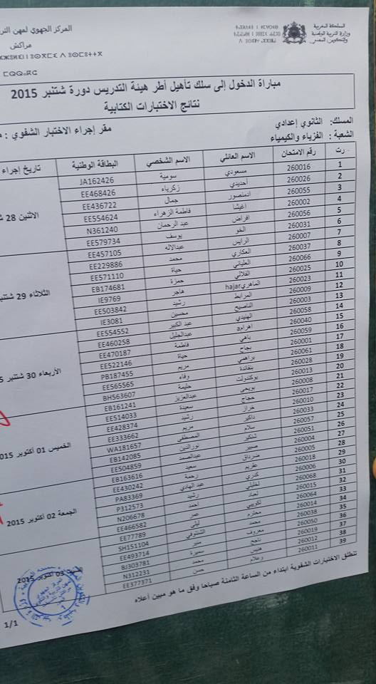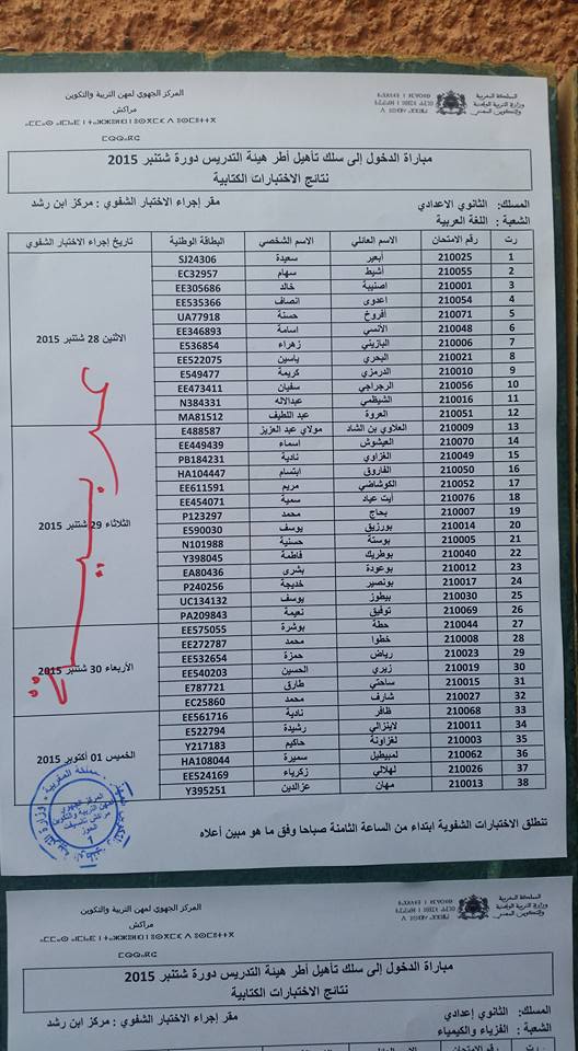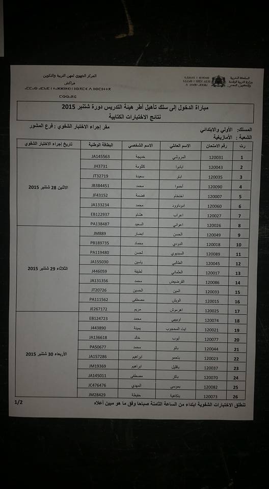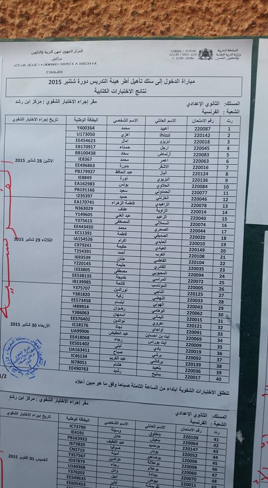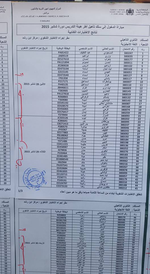 Alwadifa Marrakech / Par ville / Resultats du concours وظائف مراكش نتائج الإمتحان الكتابي من مباراة ولوج المراكز الجهوية لمهن التربية والتكوين ShareSharePin It مراكش نتائج الإمتحان الكتابي من مباراة ولوج المراكز الجهوية لمهن التربية والتكوين 2015-2016 مراكش ـ جميع الشعب ثانوي تأهيلي مراكش ـ إعدادي التربية الإسلامية و- التربية البدنية مراكش الإبتدائي مراكش إبتدائي أمازيغية مراكش