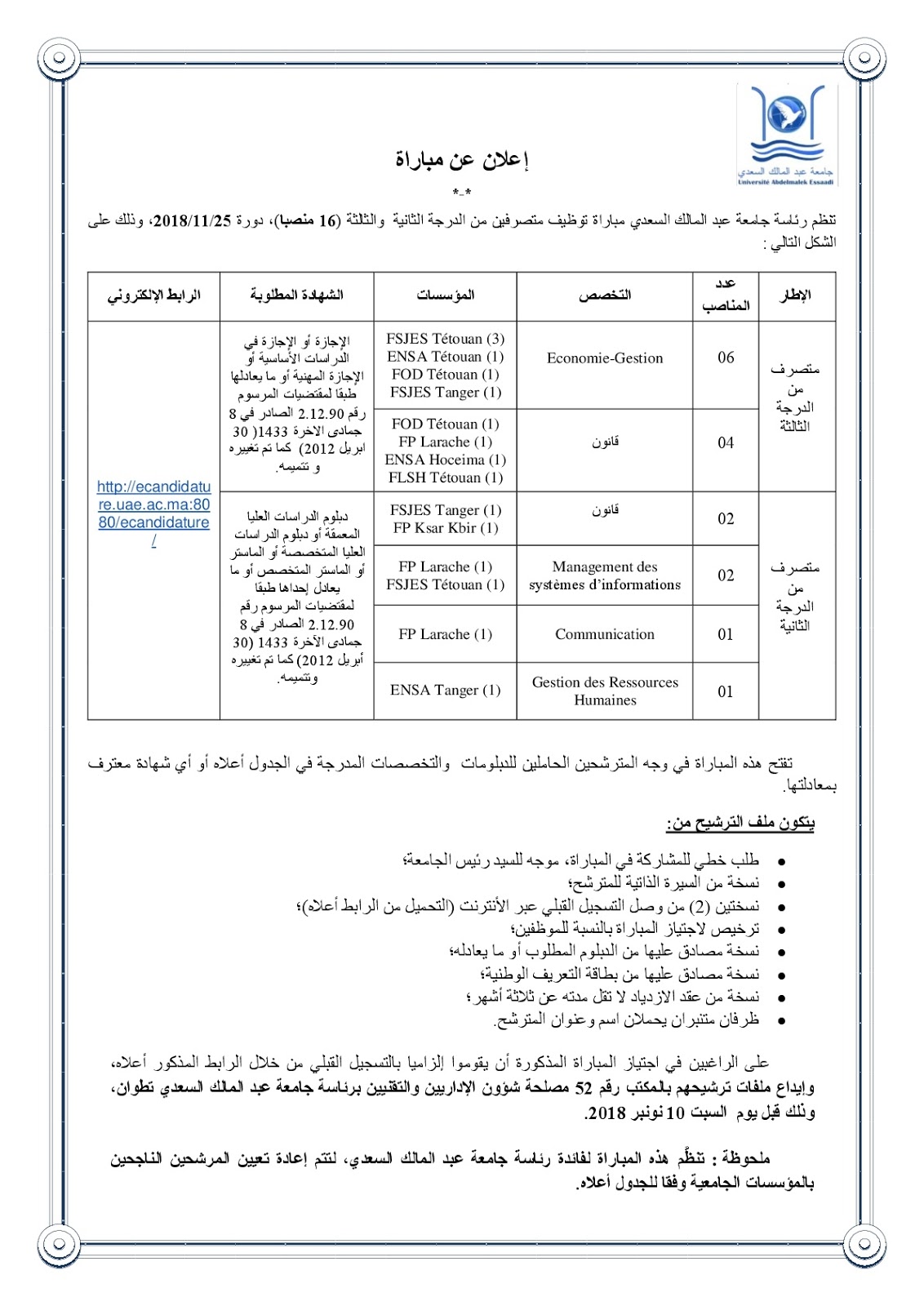 جامعة عبد المالك السعدي: مباريات لتوظيف 10 متصرفين الدرجة الثالثة و6 متصرفين الدرجة الثانية. الترشيح قبل 10 نونبر 2018