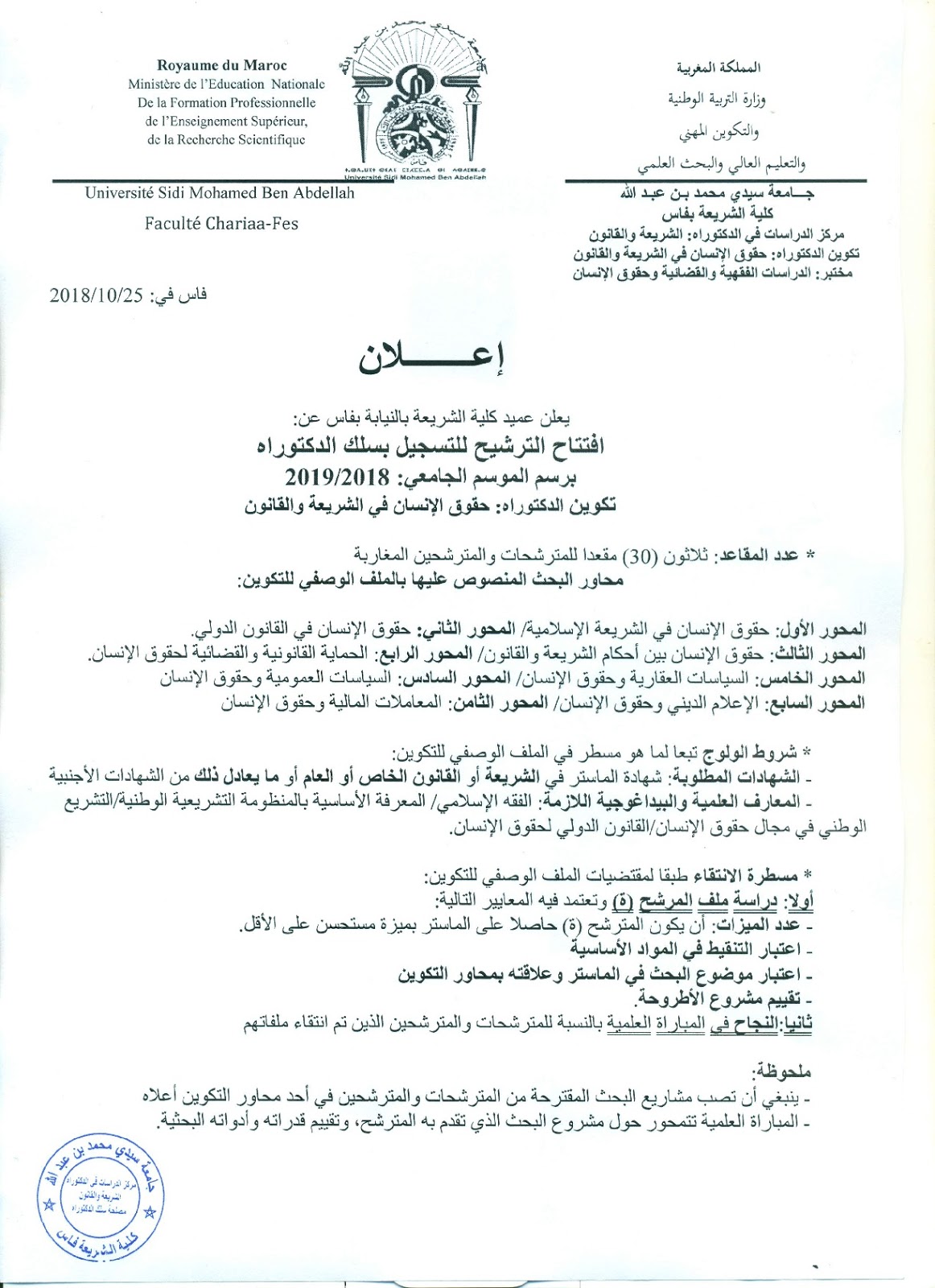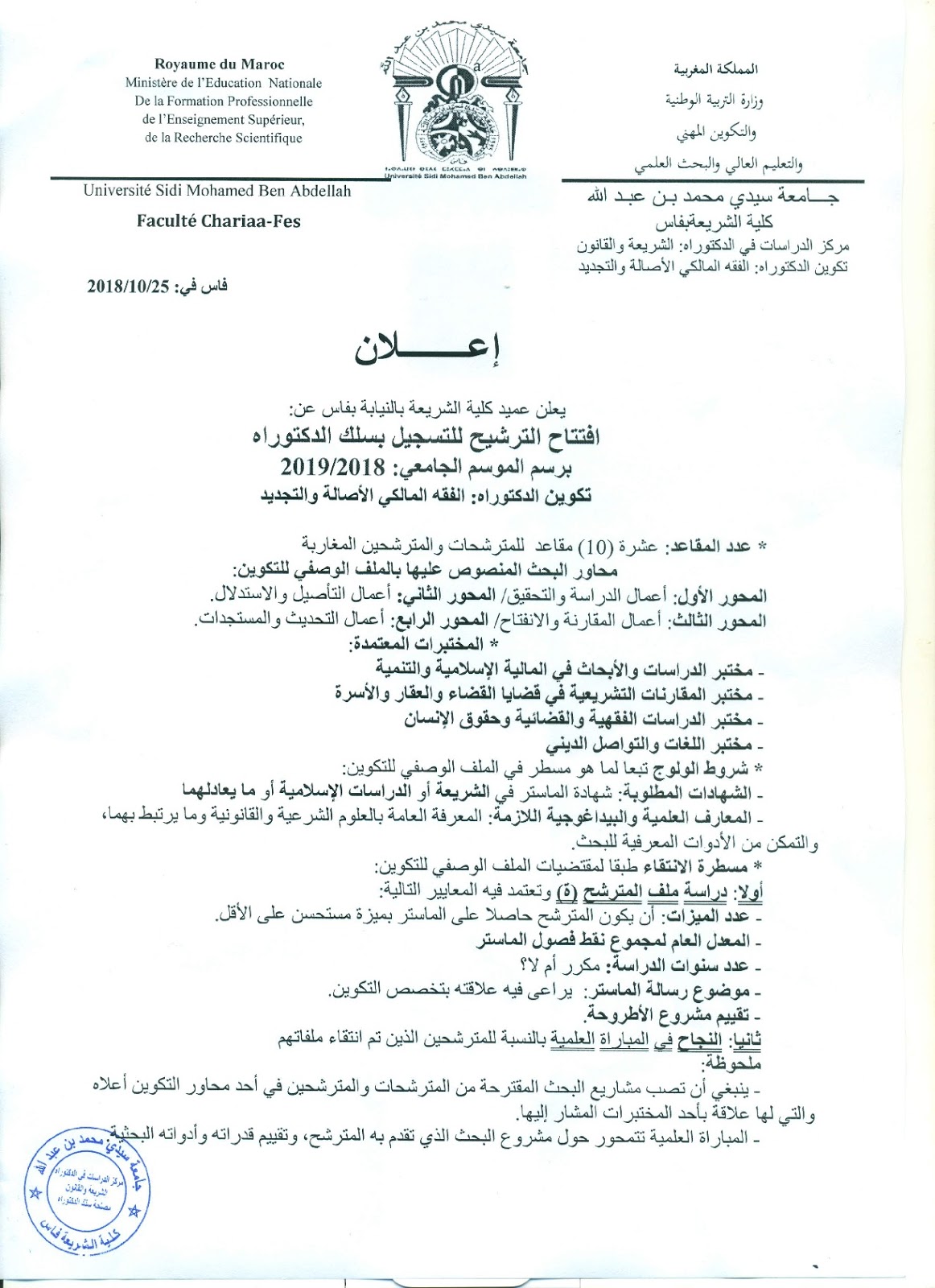 Alwadifa doctorat / Alwadifa Fes / Alwadifa Maroc / Autres offres d'emploi / Etablissement Public / Par ville / Type افتتاح الترشيح لسلك الدكتوراه للموسم الجامعي 2018-2019 بكلية الشريعة بفاس التابعة لجامعة سيدي محمد بن عبد الله ShareSharePin It افتتاح الترشيح لسلك الدكتوراه للموسم الجامعي 2018-2019 بكلية الشريعة بفاس التابعة لجامعة سيدي محمد بن عبد الله