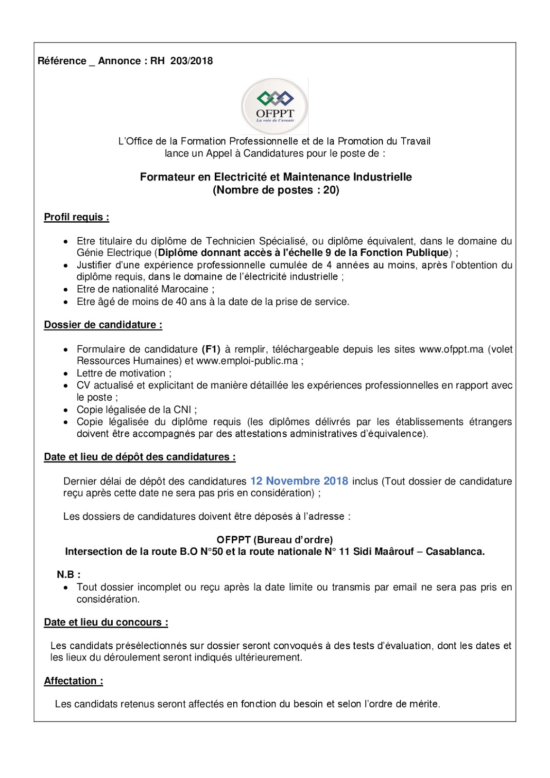 Alwadifa Maroc / Alwadifa tout le Maroc / Emploi diplomés / Offres d'emploi OFPPT / Par fonction / Par ville / Type مكتب التكوين المهني وإنعاش الشغل مباراة لتوظيف 20 مكون في الكهرباء والصيانة الصناعية آخر أجل 12 نونبر 2018 ShareSharePin It مكتب التكوين المهني وإنعاش الشغل مباراة لتوظيف 20 مكون في الكهرباء والصيانة الصناعية آخر أجل 12 نونبر 2018