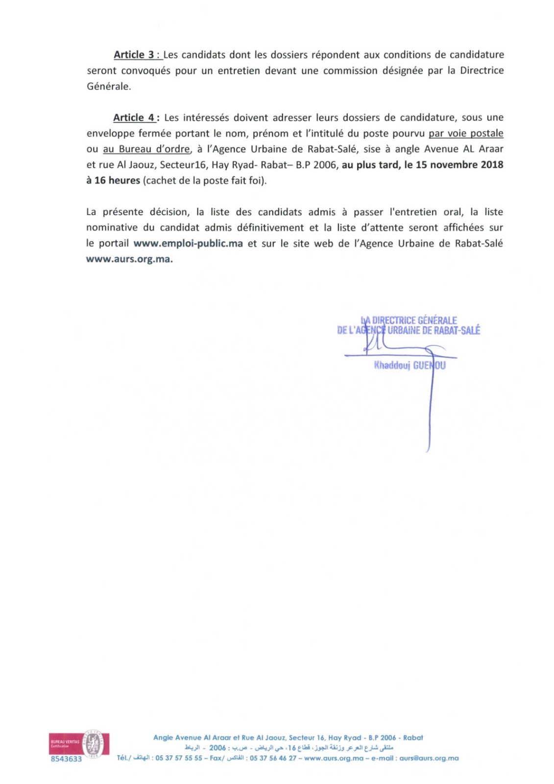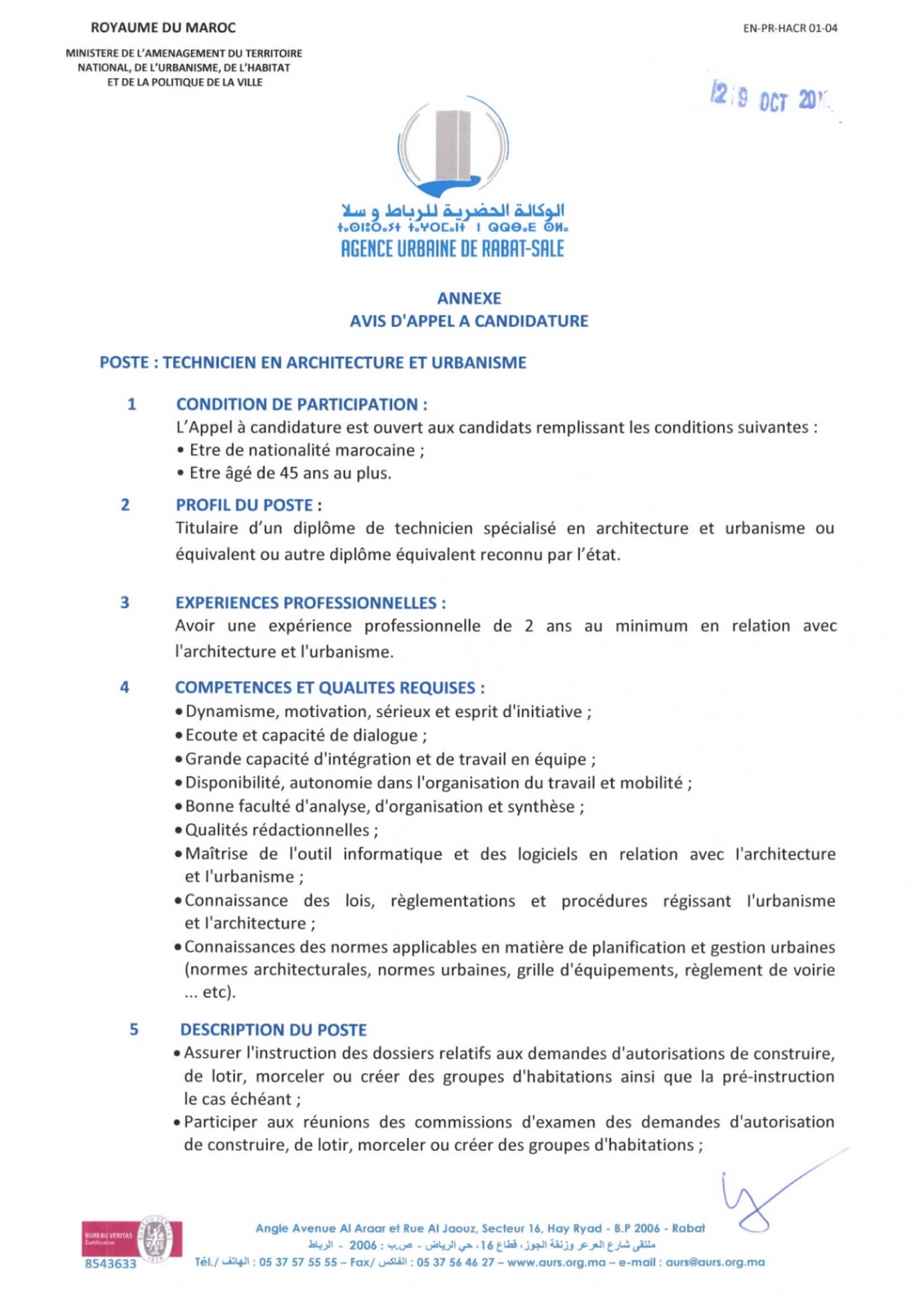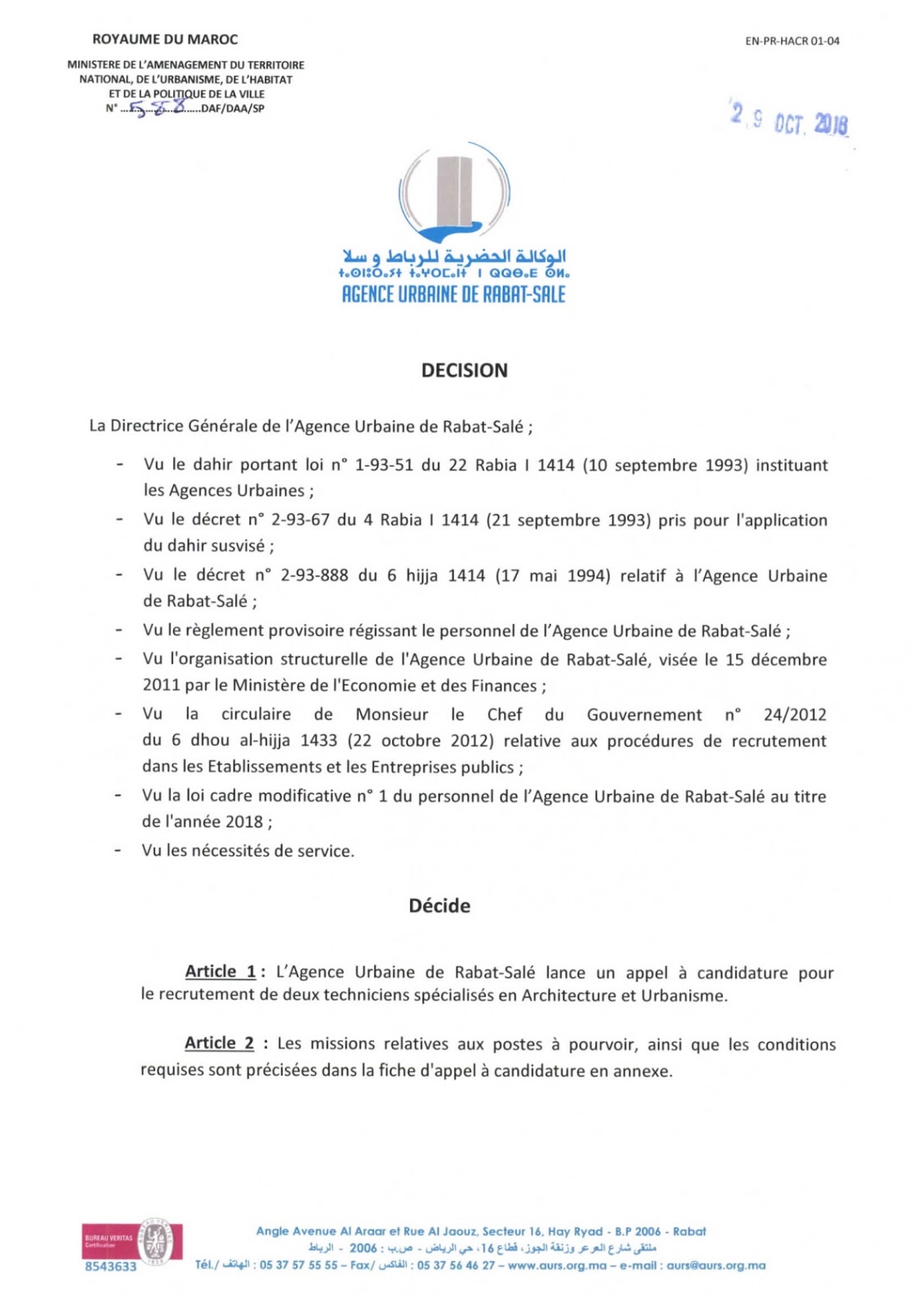 Alwadifa Maroc / Alwadifa Rabat / Alwadifa Salé / Alwadifa technicien / Autres offres d'emploi / Etablissement Public / Offres d'emploi technicien / Par fonction / Par ville / Type الوكالة الحضرية للرباط وسلا مباراة لتوظيف 02 تقنيين متخصص في الهندسة المعمارية والتعمير آخر أجل 15 نونبر 2018 ShareSharePin It الوكالة الحضرية للرباط وسلا مباراة لتوظيف 02 تقنيين متخصص في الهندسة المعمارية والتعمير آخر أجل 15 نونبر 2018