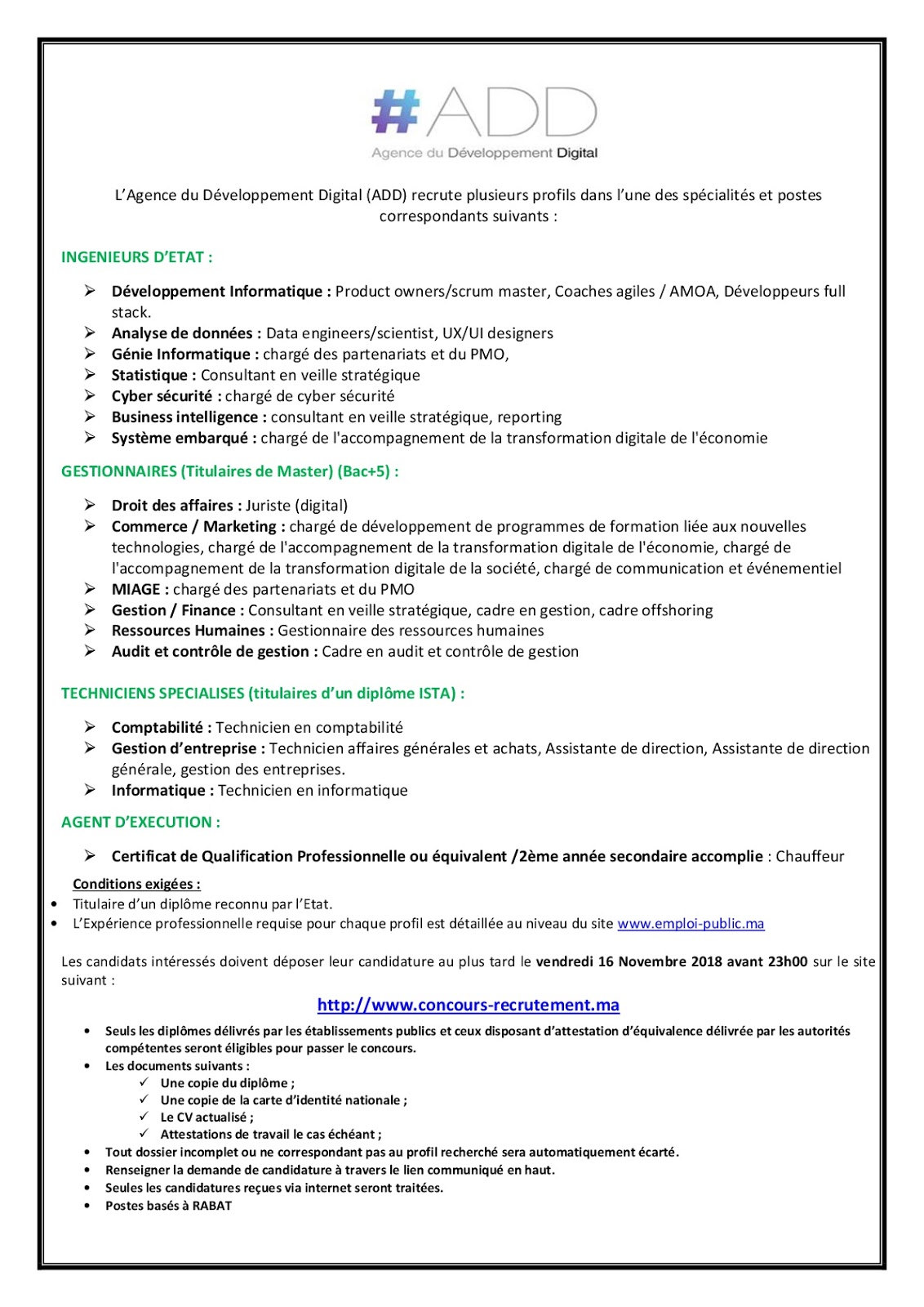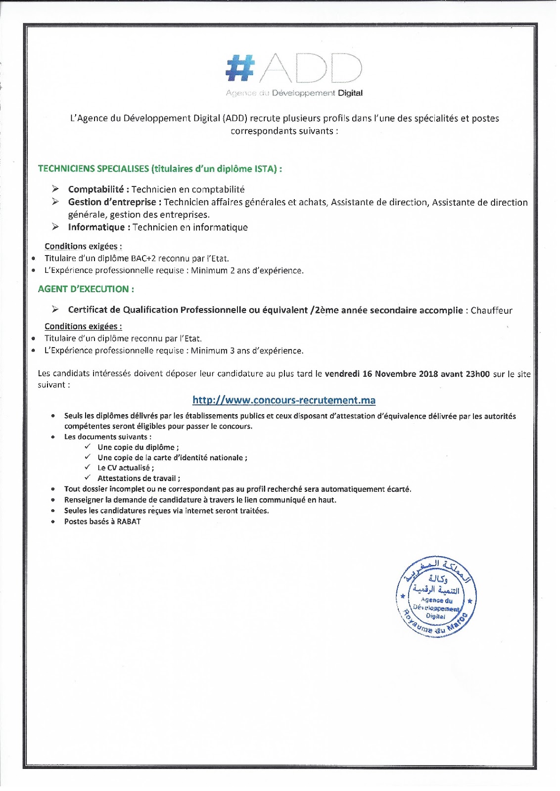 Alwadifa Maroc / Alwadifa technicien / Alwadifa tout le Maroc / Autres offres d'emploi / Emploi diplomés / Offres d'emploi ANAPEC / Offres d'emploi technicien / Par fonction / Par ville / Type وكالة التنمية الرقمية مباراة لتوظيف 09 تقنين و عون تنفيدي آخر أجل 16 نونبر 2018 ShareSharePin It وكالة التنمية الرقمية مباراة لتوظيف 09 تقنين و عون تنفيدي آخر أجل 16 نونبر 2018