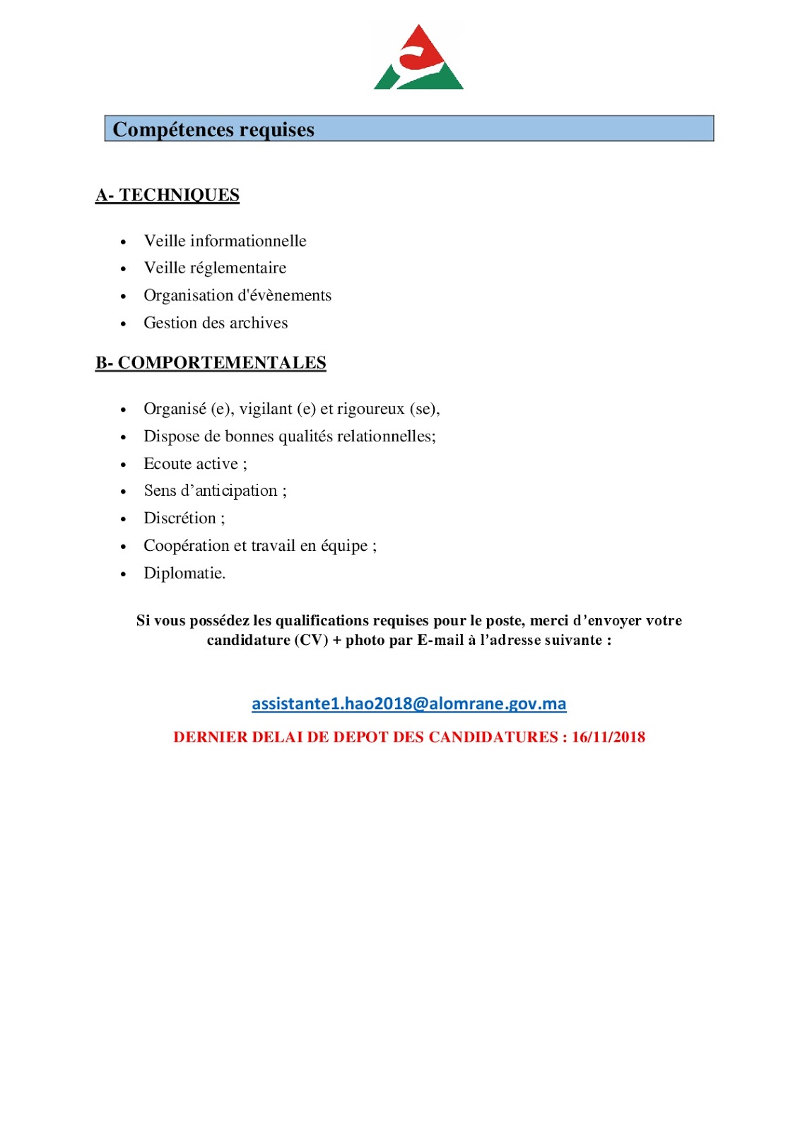 Alwadifa Maroc / Alwadifa tout le Maroc / Emploi diplomés / Etablissement Public / Par fonction / Par ville / Type مجموعة التهيئة العمران مباراة لتوظيف مساعدة إدارية بمجموعة العمران آخر أجل 16 نونبر 2018 ShareSharePin It مجموعة التهيئة العمران مباراة لتوظيف مساعدة إدارية بمجموعة العمران آخر أجل 16 نونبر 2018