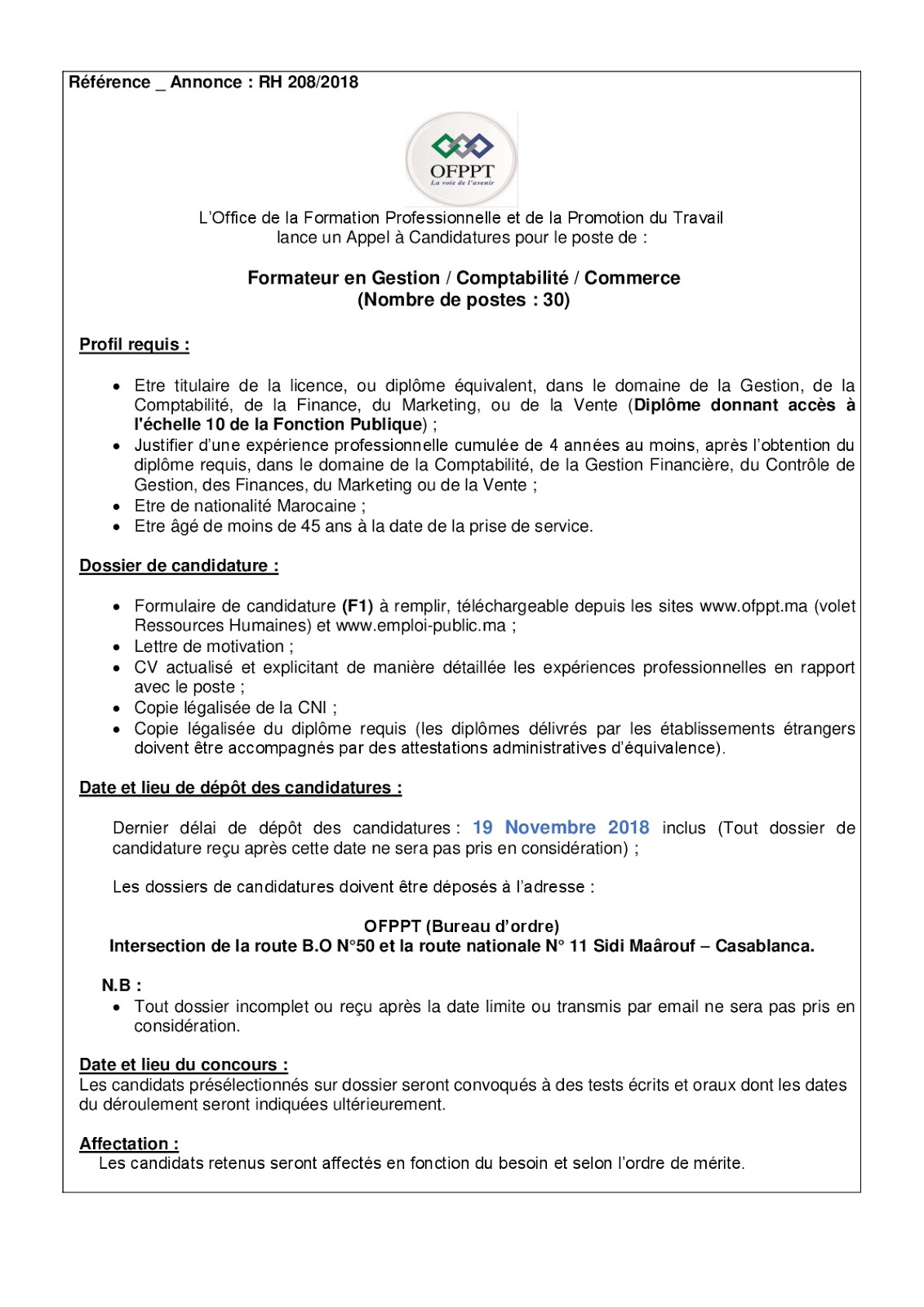Alwadifa Maroc / Alwadifa tout le Maroc / Emploi diplomés / Offres d'emploi OFPPT / Par fonction / Par ville / Type مكتب التكوين المهني وإنعاش الشغل مباراة لتوظيف 30 مكون في التدبير والمحاسبة والتجارة أجل 19 نونبر 2018 ShareSharePin It مكتب التكوين المهني وإنعاش الشغل مباراة لتوظيف 30 مكون في التدبير والمحاسبة والتجارة أجل 19 نونبر 2018
