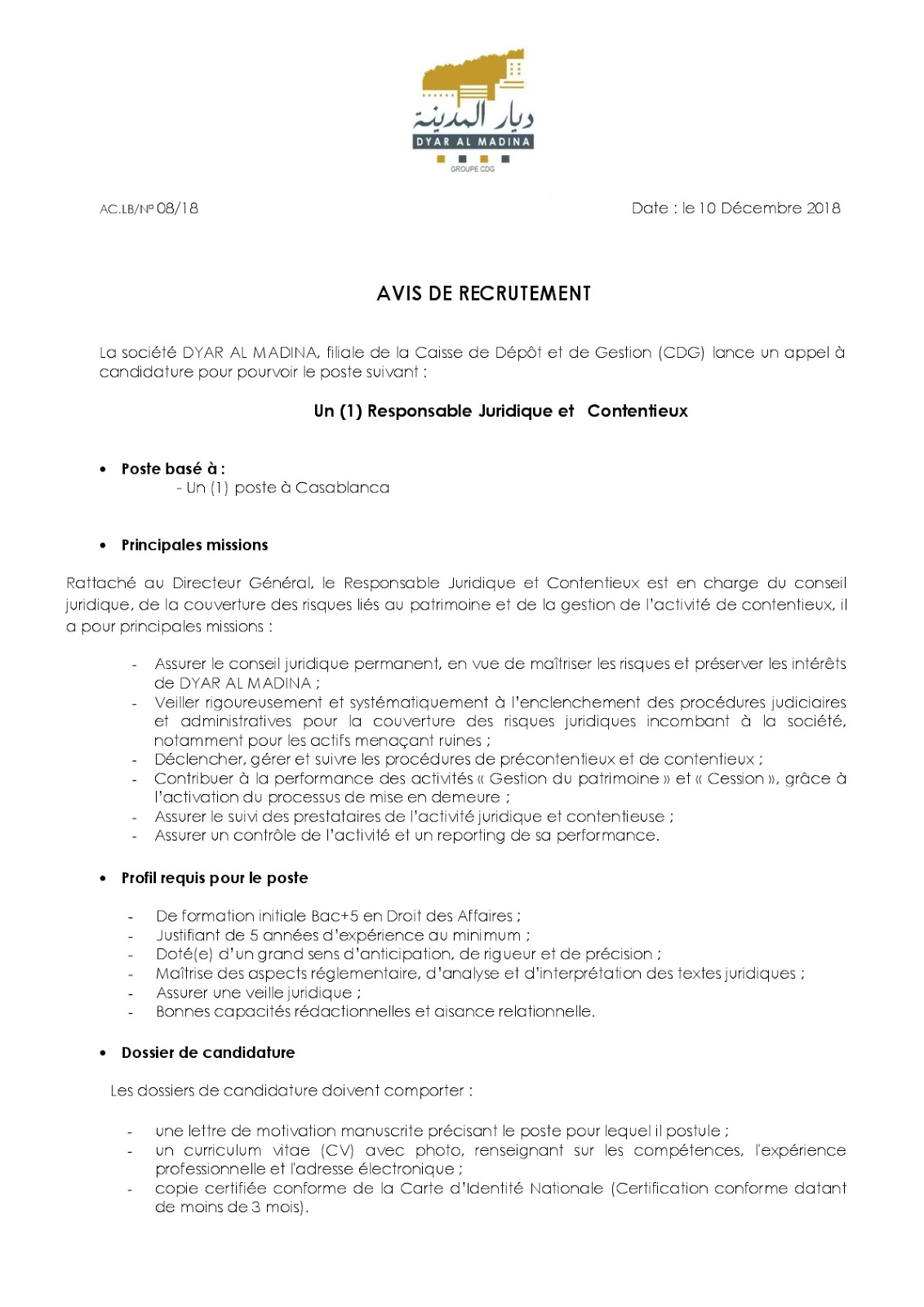 Alwadifa Maroc / Alwadifa tout le Maroc / Emploi diplomés / Offres d'emploi Bac + 5 / Offres d'emploi CDG / Par fonction / Par ville / Type ديار المدينة التابعة لصندوق الايداع والتدبير مباراة توظيف مسؤول الشؤون القانونية والتقاضي آخر أجل 25 دجنبر 2018 ShareSharePin It ديار المدينة التابعة لصندوق الايداع والتدبير مباراة توظيف مسؤول الشؤون القانونية والتقاضي آخر أجل 25 دجنبر 2018 نص الاعلان اضغط هنا