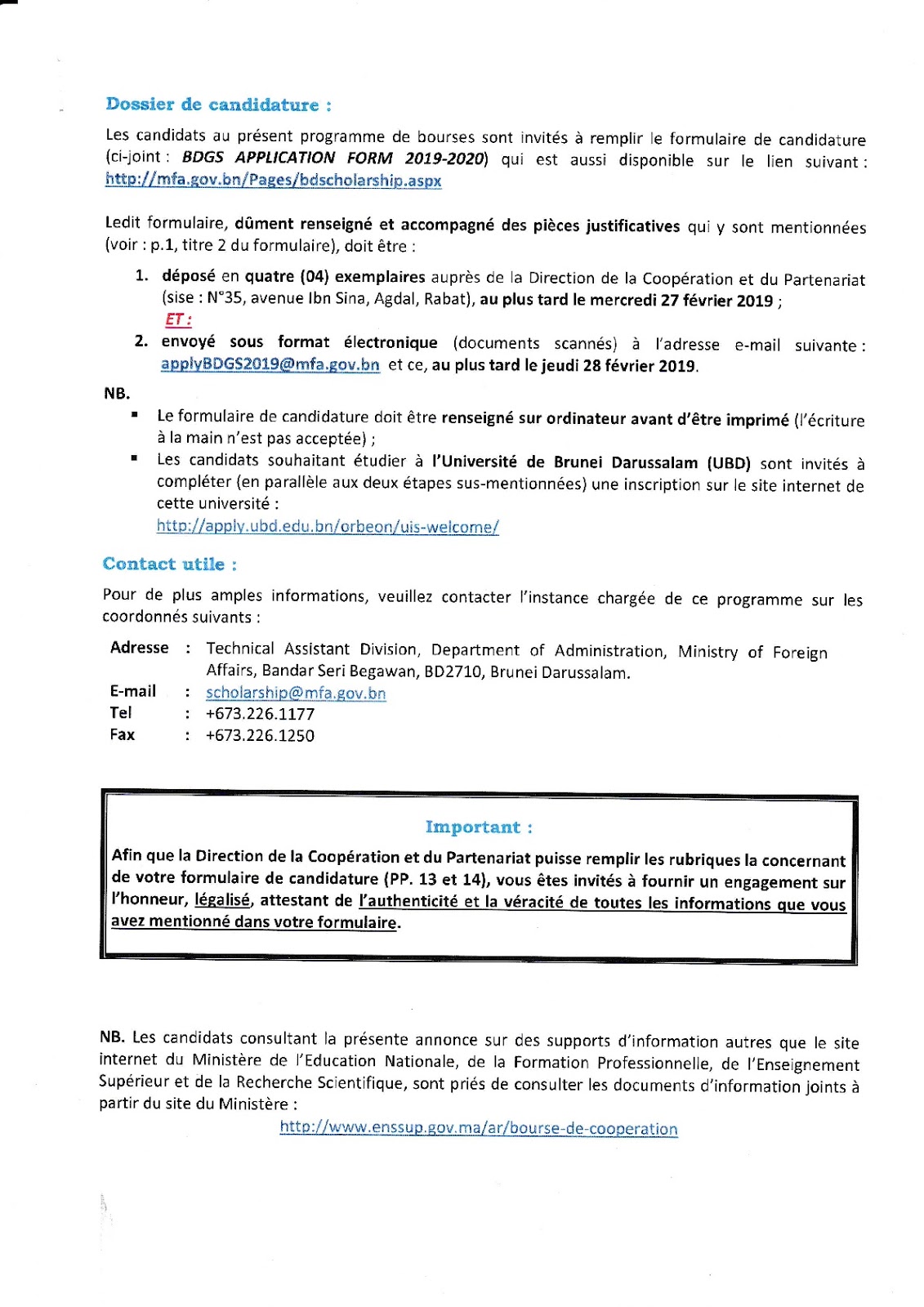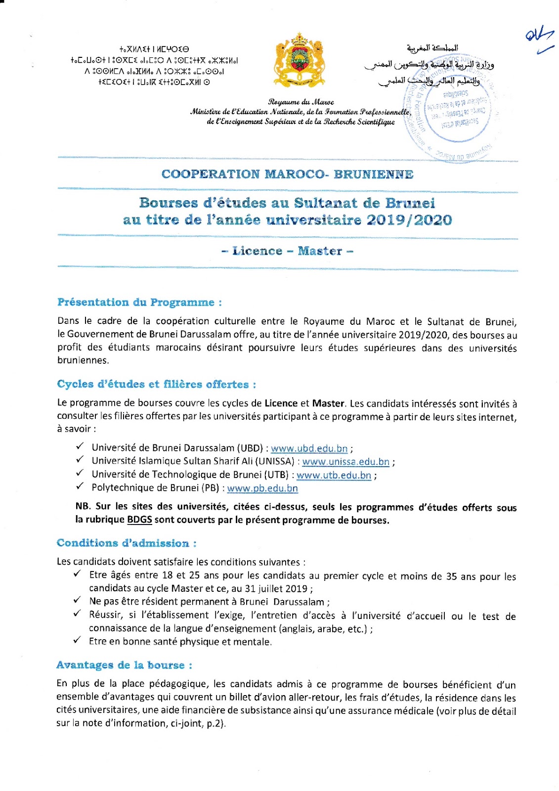 Alwadifa Maroc / Autres offres d'emploi / Bourses d'études سلطنة بروناي: منح الدراسة برسم الموسم الجامعي 2020/2019 ShareSharePin It سلطنة بروناي: منح الدراسة برسم الموسم الجامعي 2020/2019 المرفقات 1_Brunei_Annonce_Bourses_2019_2020 2_Brunei_Guide de candidature_19_20 3_BDGS APPLICATION FORM 2019-2020