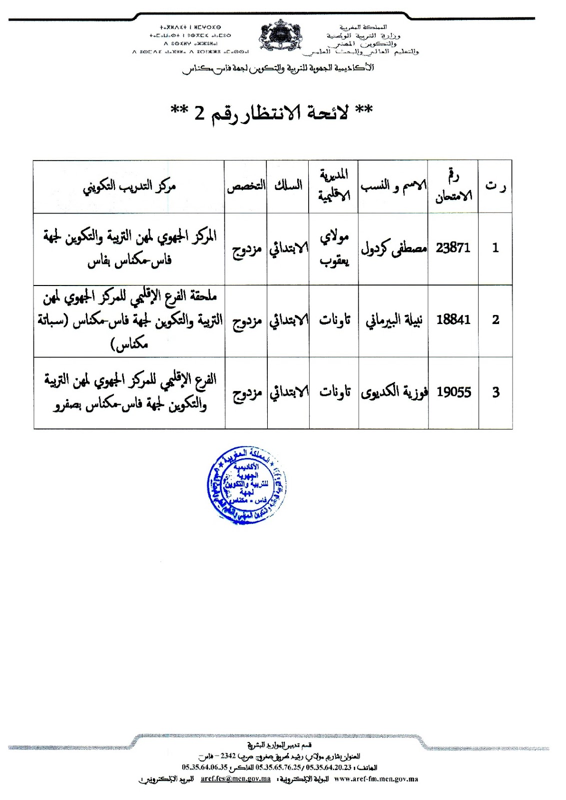الأكاديمية الجهوية للتربية والتكوين لجهة فاس مكناس لائحة الانتظار رقم 02 لمباراة توظيف الأساتذة موظفي الأكاديمية دورة دجنبر 2018
