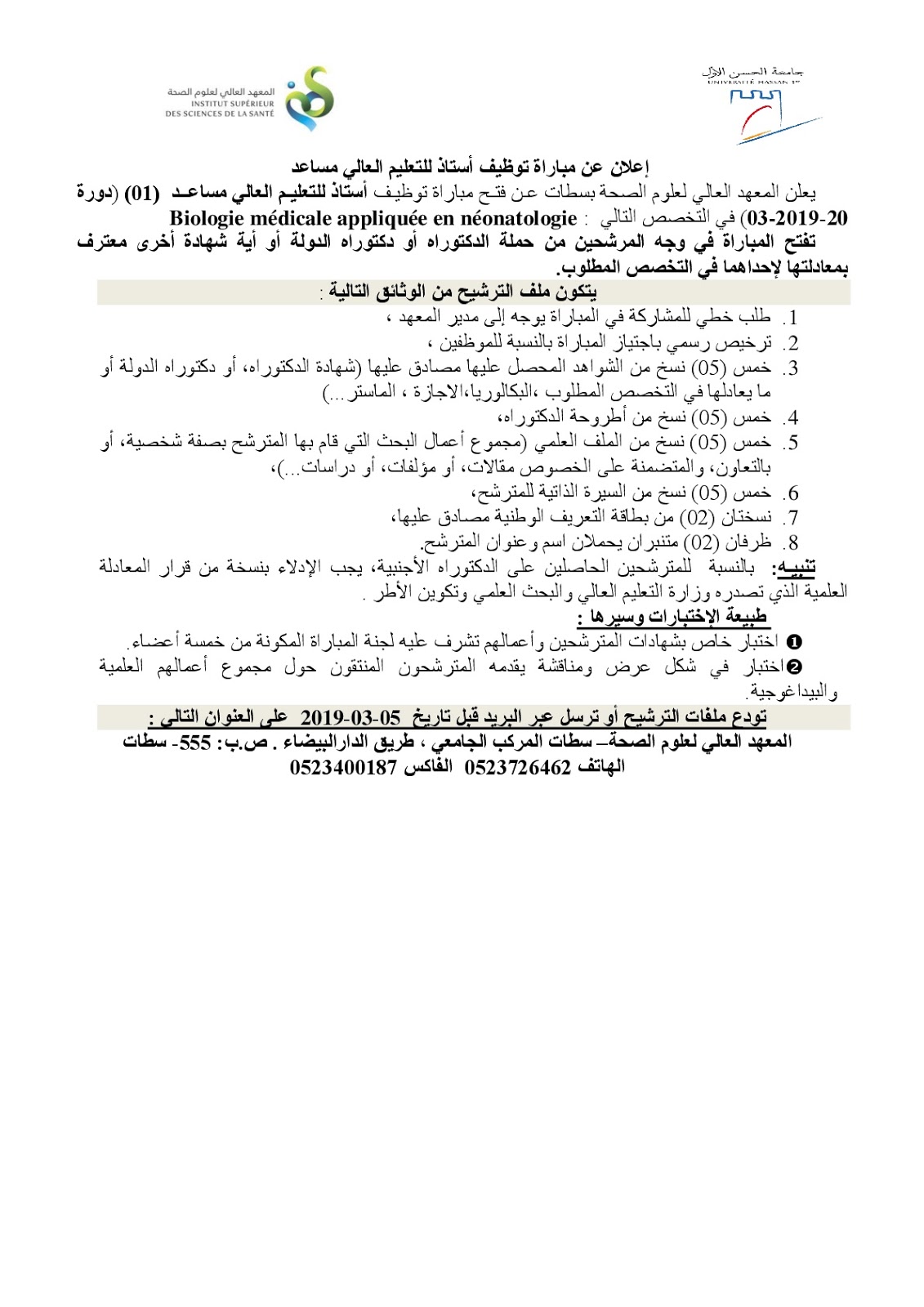 Alwadifa doctorat / Alwadifa Maroc / Alwadifa Settat / Autres offres d'emploi / Etablissement Public / Offres d'emploi doctorat / Par fonction / Par ville / Type المعهد العالي لعلوم الصحة سطات مباراة لتوظيف استاذ التعليم العالي مساعد آخر أجل 4 مارس 2019 ShareSharePin It المعهد العالي لعلوم الصحة سطات مباراة لتوظيف استاذ التعليم العالي مساعد آخر أجل 4 مارس 2019